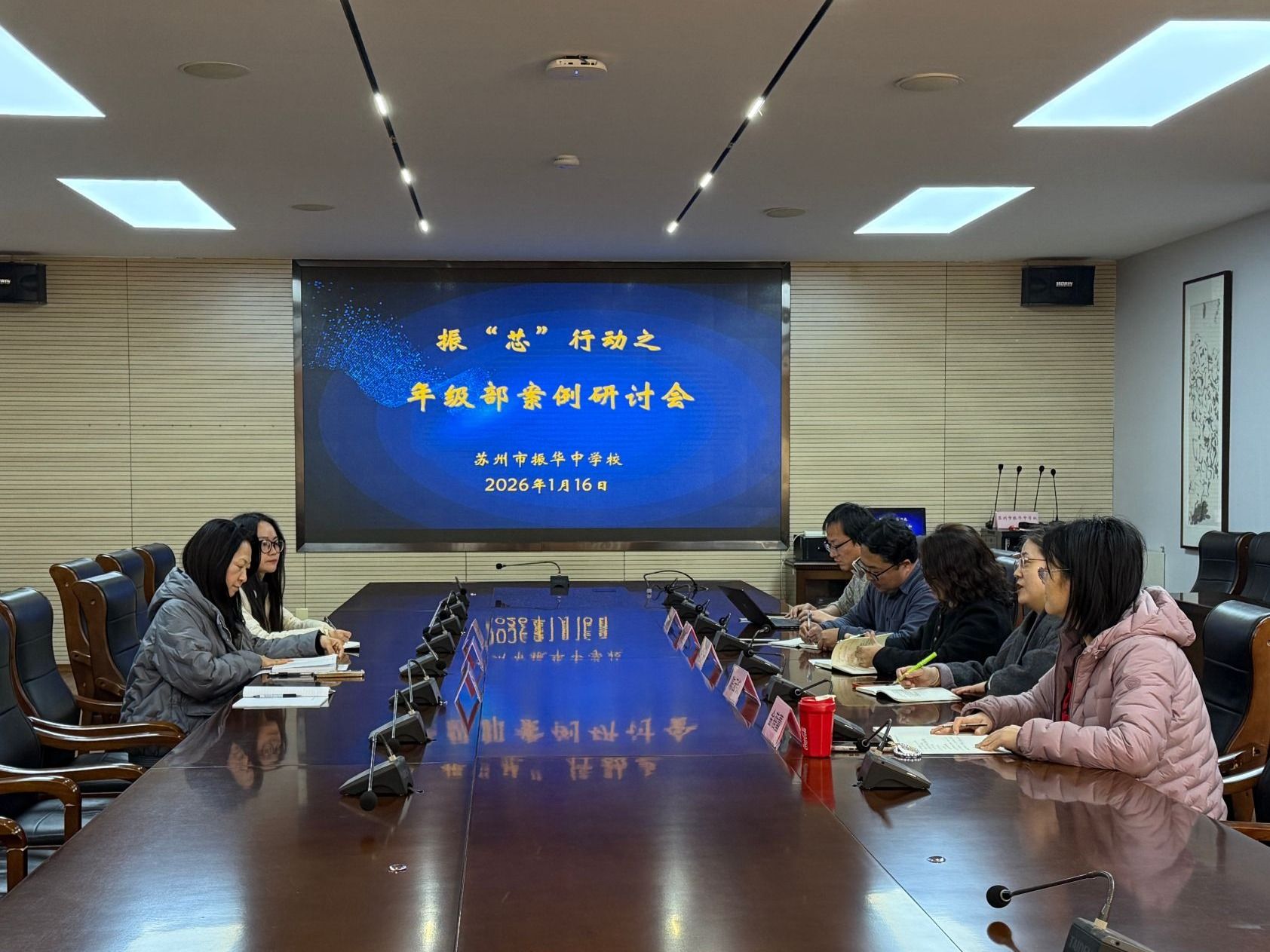 为扎实推进学校润心工作落地,深化振“芯”行动育人实效,2026年1月16日中午,苏州市振华中学校开展了振“芯”行动之年级部案例研讨会。德育处金蓓蕾主任、陈沛副主任,初一至初三年级部主任陈云钏、卢彩、黄梦慰与心理室团队老师及驻校社工共同参会,围绕本学期以来的心理工作开展情况、重点关注学生帮扶情况等内容展开深入交流,搭建了学校心理工作交流互通平台。会议由德育处主任金蓓蕾老师主持。