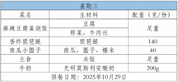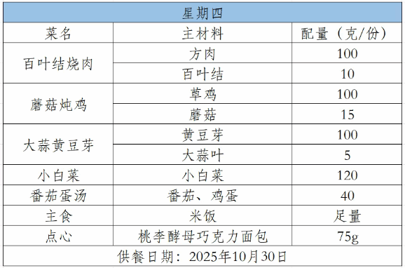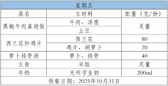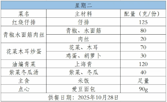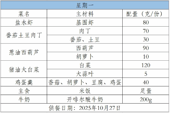 2025-2026学年第一学期第九周菜谱(10月27日-10月31日)