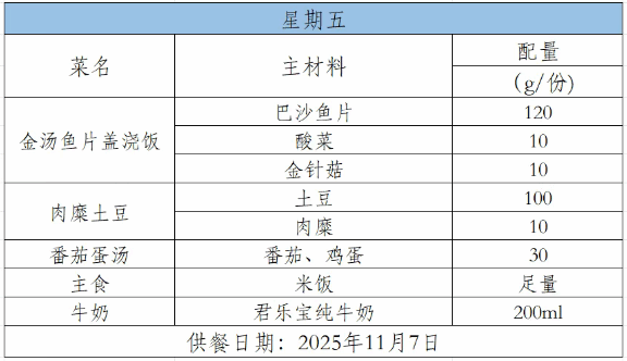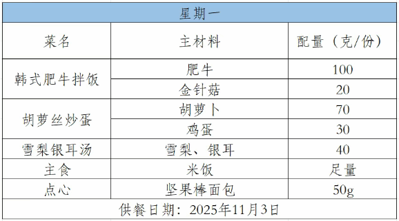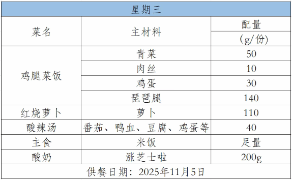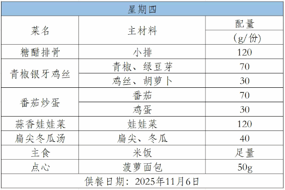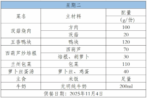 2025-2026学年第一学期第十周菜谱(11月3日-11月7日)