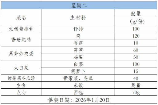 2025-2026学年第一学期第二十周菜谱(1月12日-1月16日)