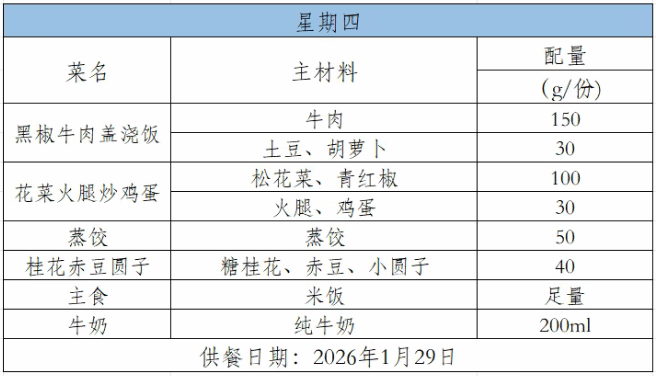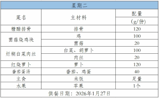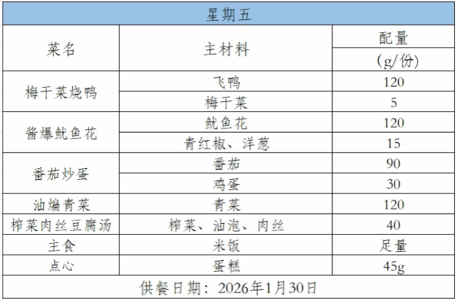 2025-2026学年第一学期第二十二周菜谱(1月26日-1月30日)