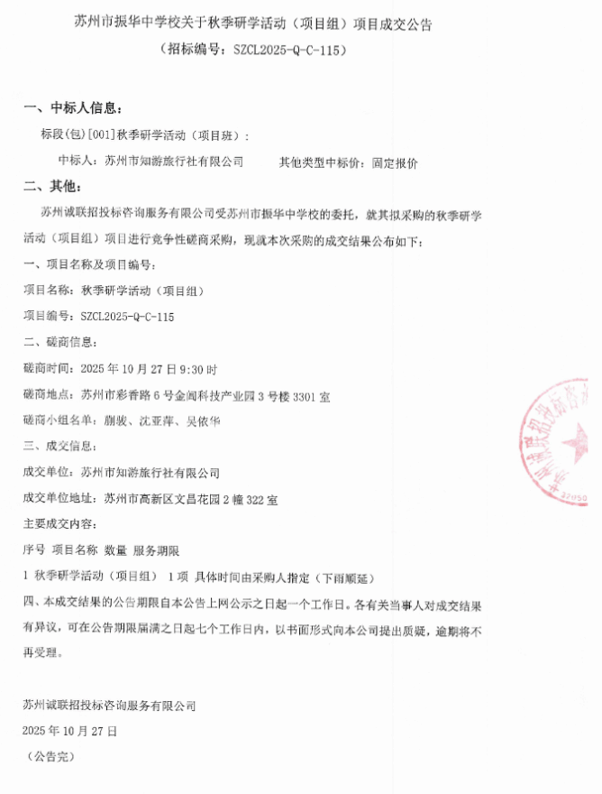 苏州市振华中学校关于秋季研学活动(项目组)项目成交公告
