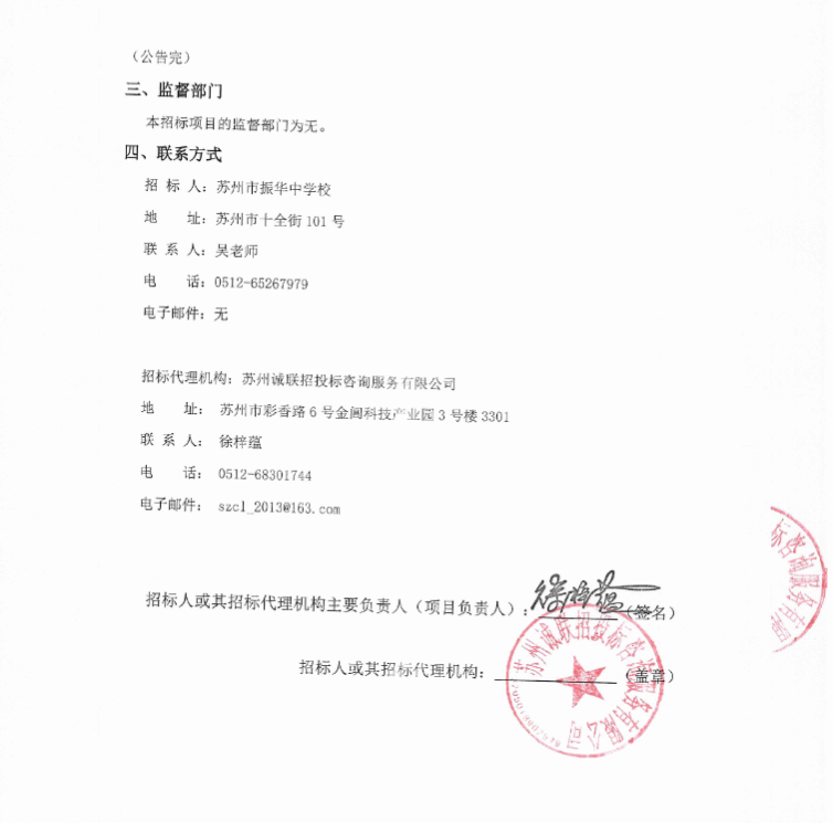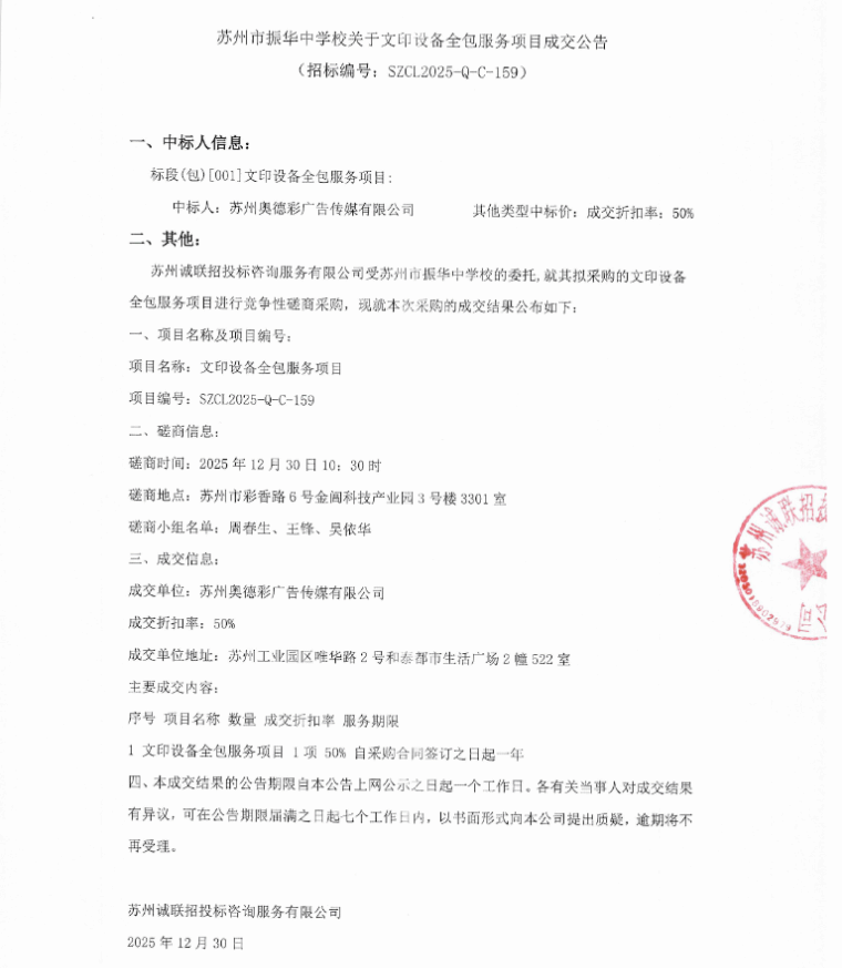 苏州市振华中学校关于文印设备全包服务项目成交公告
