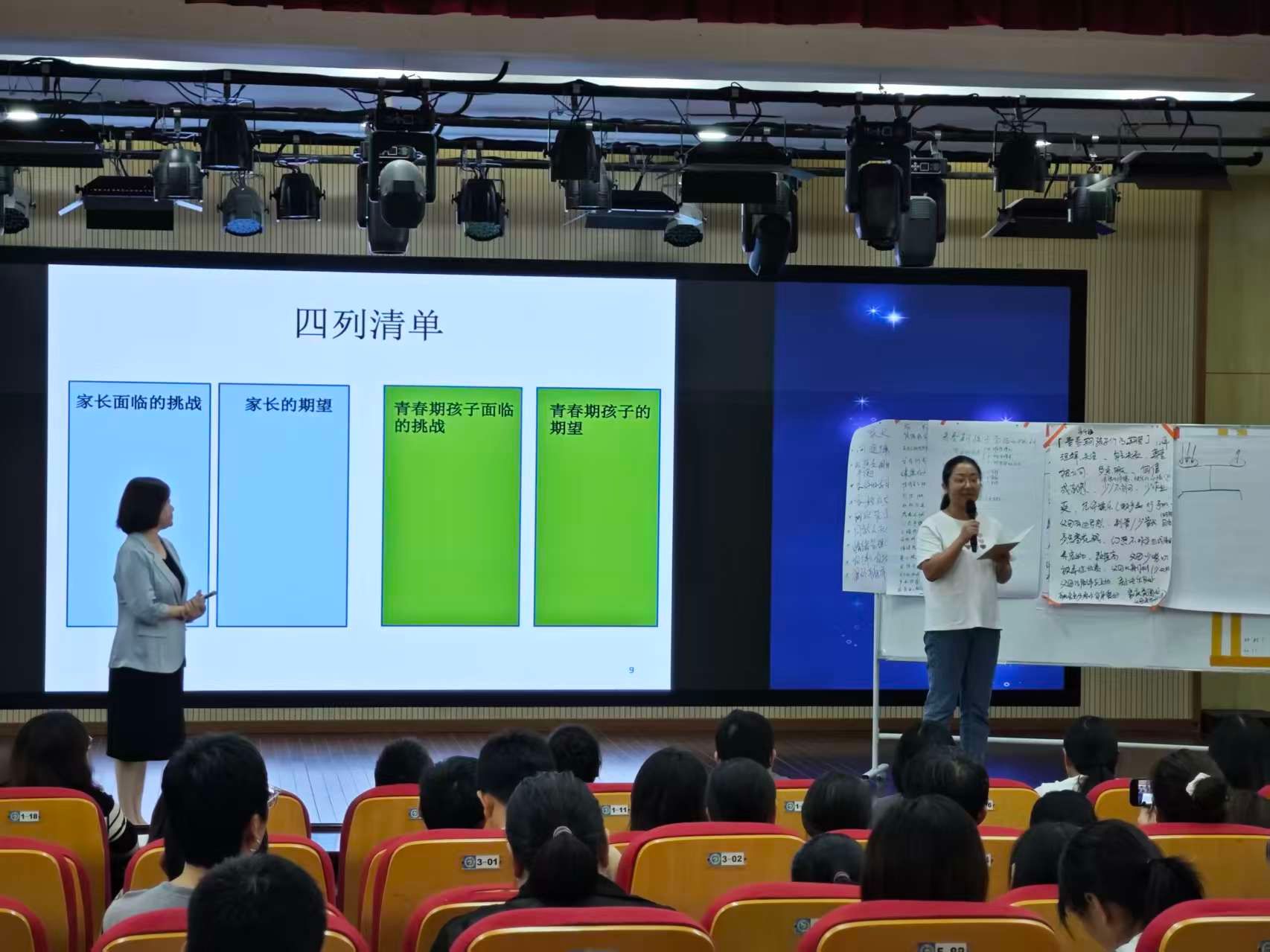 随后,本次课程的主讲人——资深家庭教育指导专家马文兰老师带领2025级的学生家长代表开启了课程。本次课程共有九次系列活动,第一次的主题是《养育孩子面临的挑战》。马老师从青春期养育中遇到的问题引入,用梅花贴引导家长分享交流,寻找学生优点;用任务表格,帮助家长掌握家庭管理技巧;用四列清单,明晰养育期望,养育面临的挑战。精心设置的活动引导着家长沉浸于学习中,充分调动了家长的学习积极性,课堂气氛。家长学员们积极参与,现场专注的眼神、会心的微笑、认真记录的笔尖,共同构成了一幅“为爱学习”的最美画卷。