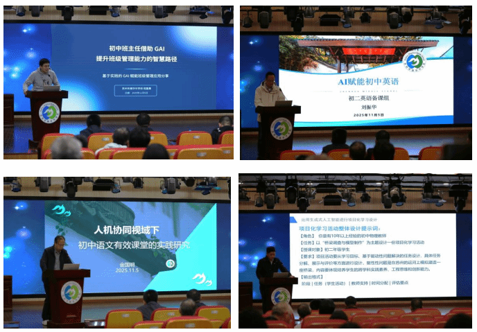 培训中,四位教师先后分享实践经验与研究成果。倪盈晟老师以“初中班主任借助GAI提升班级管理能力的智慧路径”为题,在解读GAI概念的基础上,从班会设计、学情分析、家校沟通、心理健康教育四个维度,展示了GAI在班级管理中的实际应用;刘振华老师围绕“数智作业”展开,依次介绍数智作业模式、实用AI工具及AI对学科教学的赋能策略;金国明老师结合听课实践,分享“人机协同视域下初中语文有效课堂的实践研究”的思考与感悟;程建军老师以“人工智能加持下的项目化学习设计与实施”为例,重点阐释人机协同的意义与价值,提出其可助力构建生动、互动、有深度的课堂。