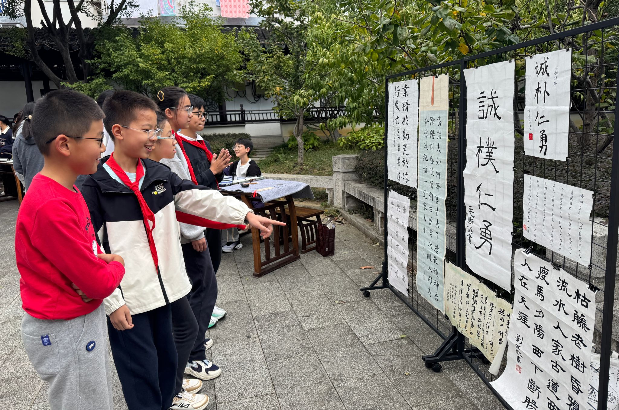 10月23日中午,振华相云园热闹非凡,本色书法社在这里举办了一场书法快闪活动。书法社团成员在王皪老师的指导下,一方纸笺,写满祝福。同学们挥毫泼墨,用心书写青春诗句,寄寓对未来的美好祝愿。过往的师生们被同学们的书法作品展示深深吸引,有的驻足观看,有的还现场提笔尝试,成为学校一道靓丽的文化风景线。