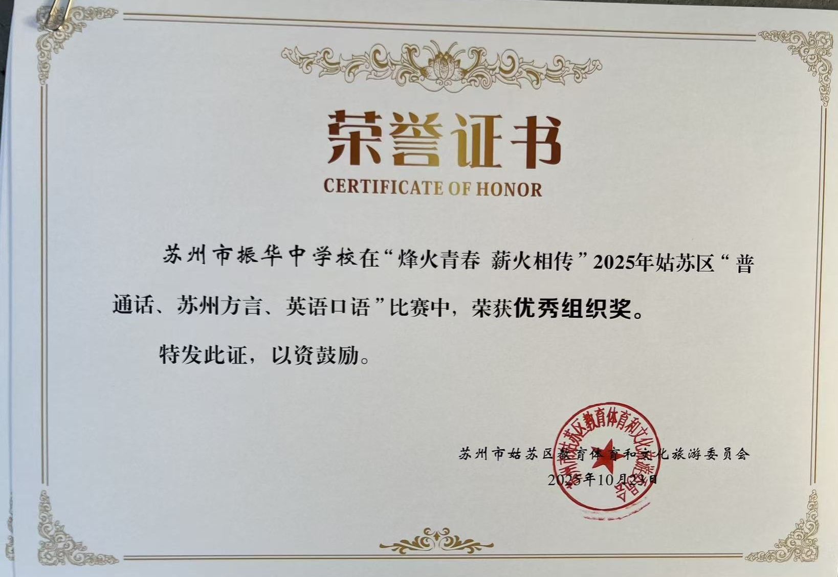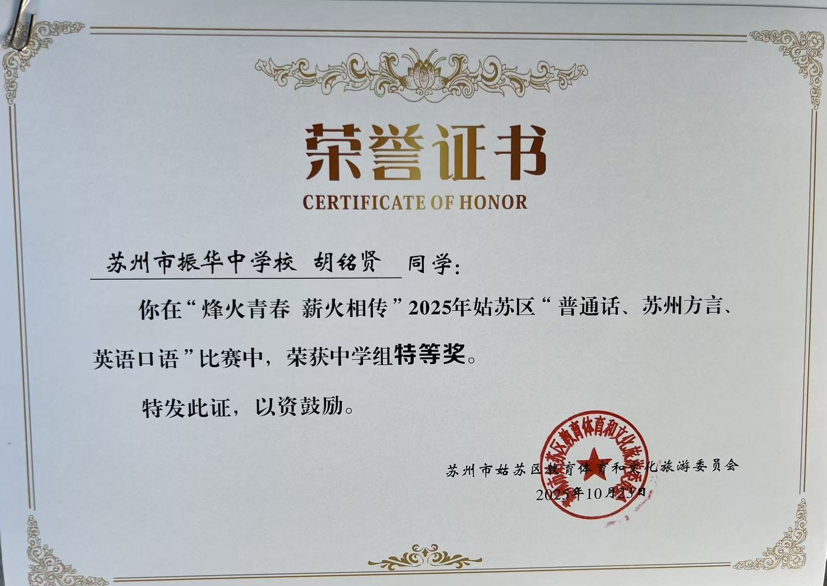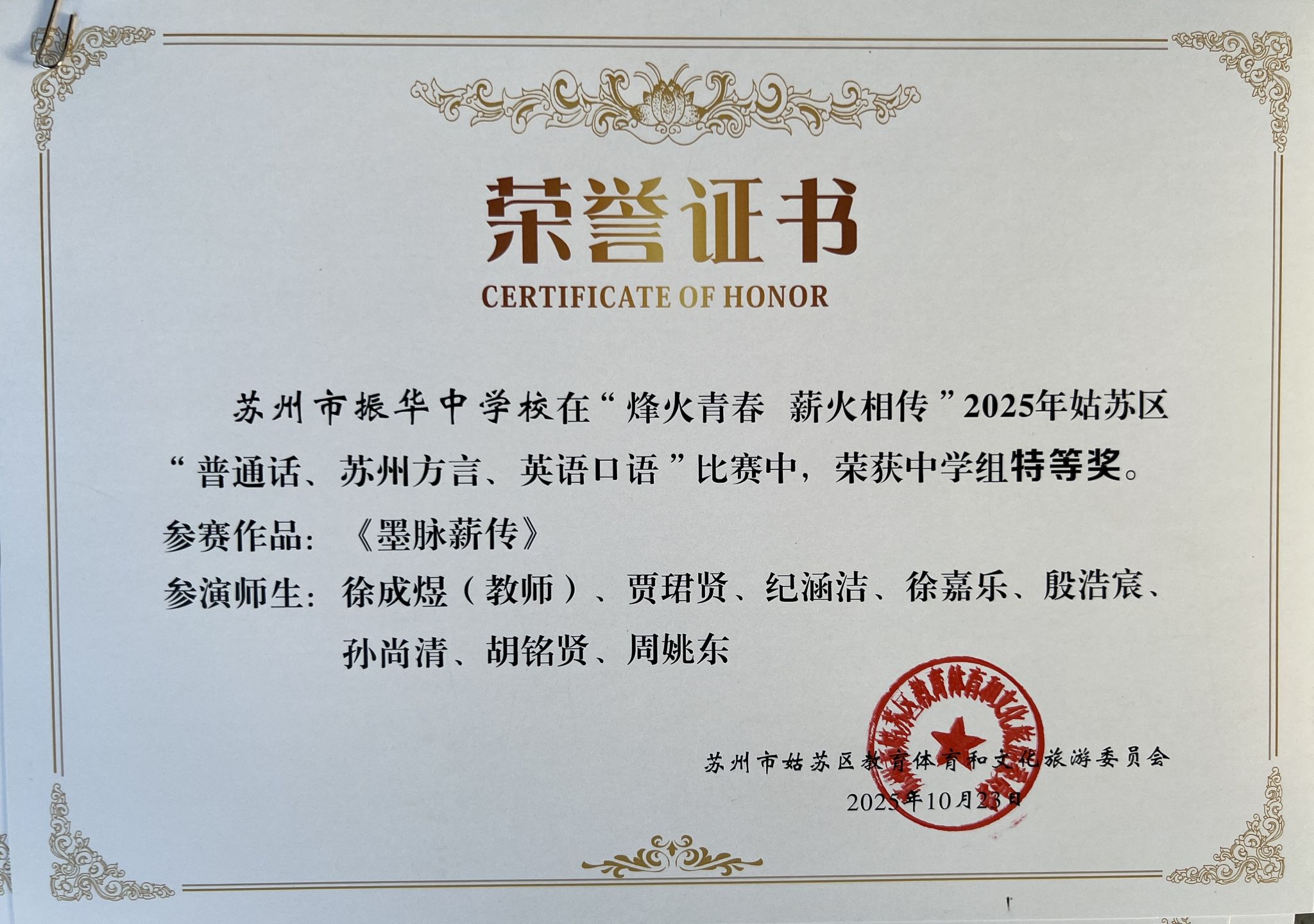 我校团队在2025年姑苏区“普通话、苏州方言、英语口语”比赛中,荣获中学组特等奖。我校师生徐成煜、贾珺贤、纪涵洁、徐嘉乐、殷浩宸、孙尚清、胡铭贤、周姚东参演,参赛作品为《墨脉薪传》。其中,主演胡铭贤同学凭借出色表现,熟练应用三种语言,荣获个人特等奖。同时,我校也在此次比赛中荣获优秀组织奖。