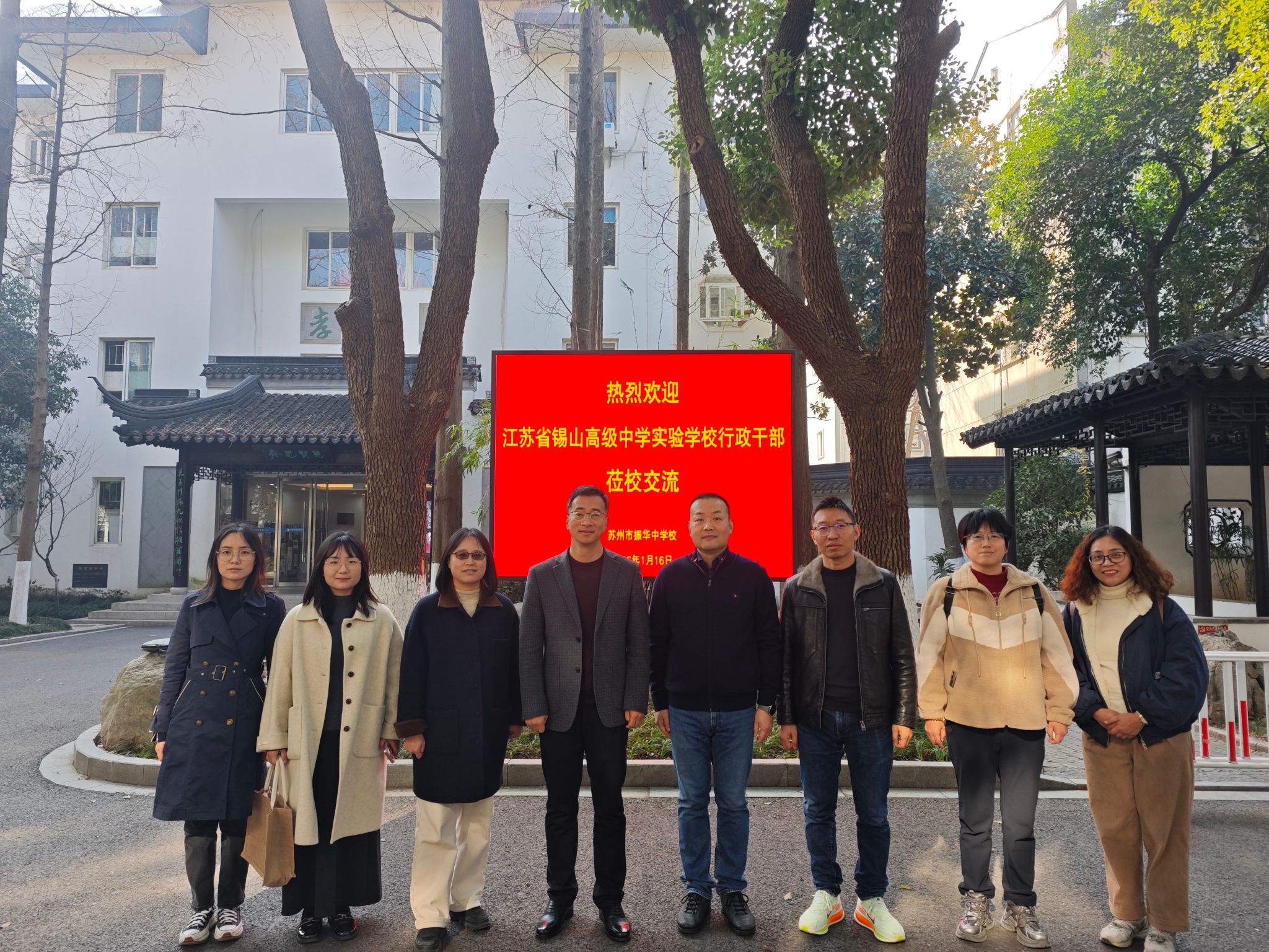 2026年1月16日,江苏省锡山高级中学实验学校行政干部代表团一行7人莅临我校开展交流研讨活动。我校王晓骅校长、对外交流处陈燕主任代表学校对行政干部的到来表示热烈欢迎,并带领团队参观了振华校园。