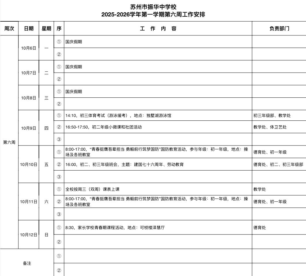 苏州市振华中学校2025-2026学年第一学期 第六周工作安排表