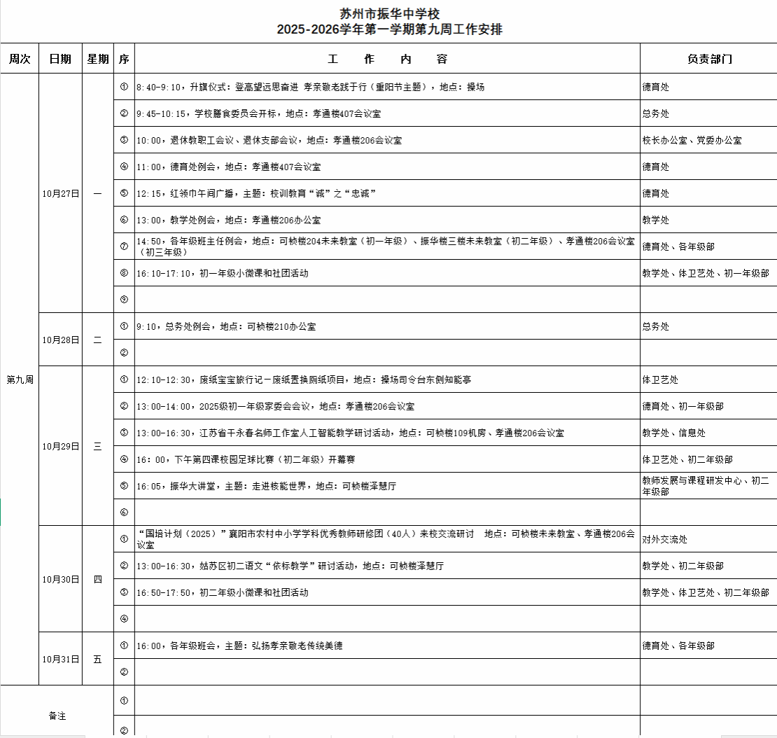 苏州市振华中学校2025-2026学年第一学期 第九周工作安排表