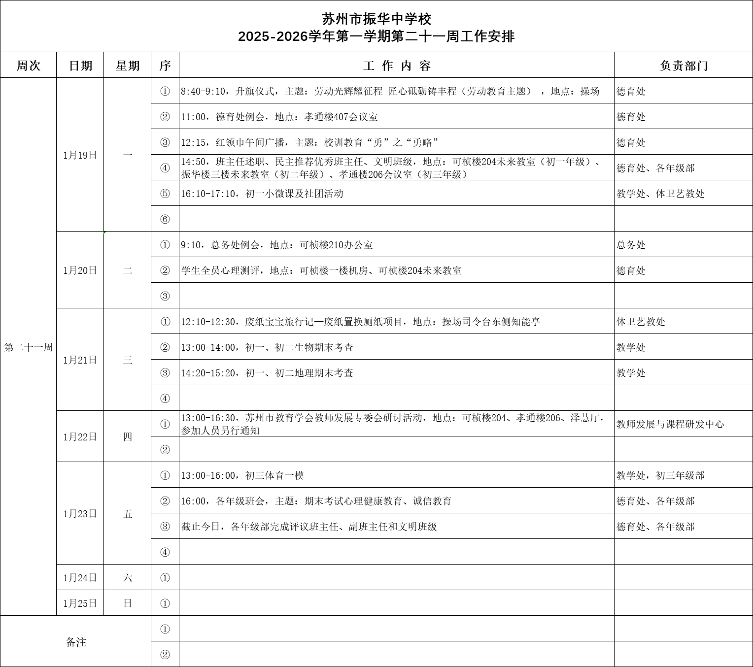 苏州市振华中学校2025-2026学年第一学期 第二十一周工作安排表