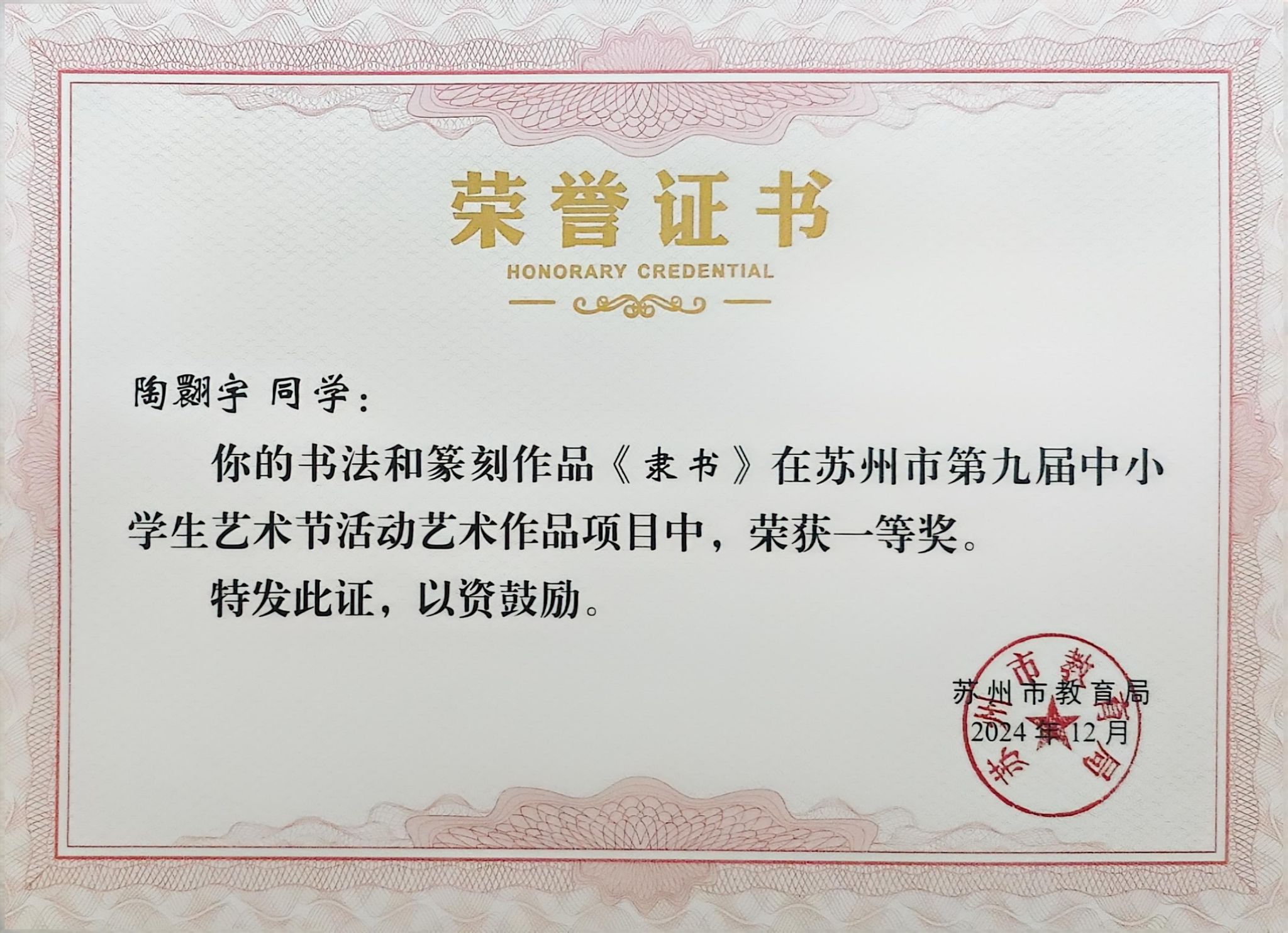热烈祝贺我校陶翾宇同学在苏州市第九届中小学生艺术节活动艺术作品项目中荣获一等奖