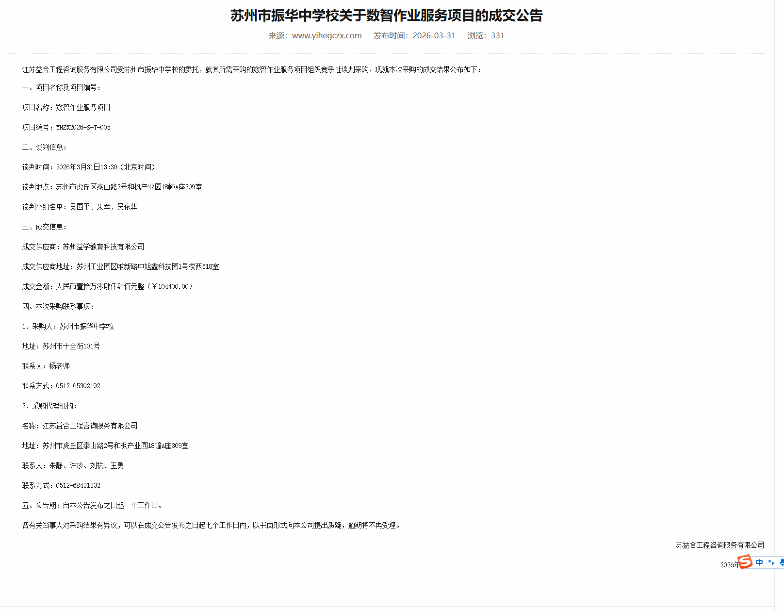 苏州市振华中学校关于数智作业服务项目的成交公告