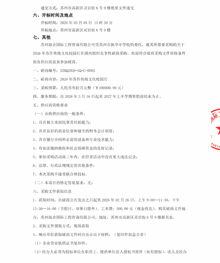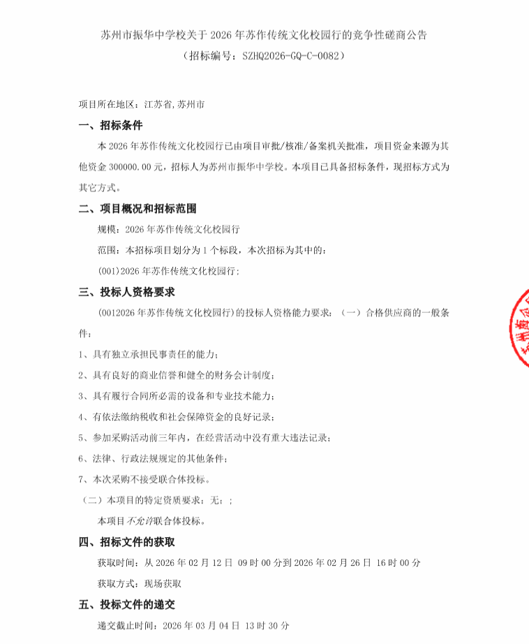 苏州市振华中学校关于2026年苏作传统文化校园行的竞争性磋商公告