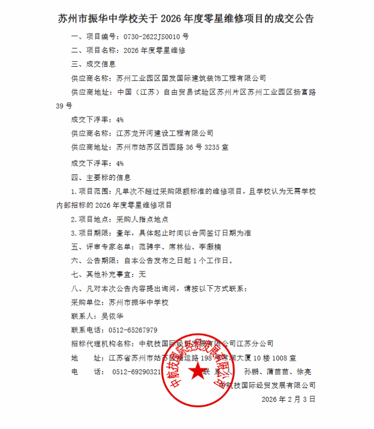 苏州市振华中学校关于2026年度零星维修项目的成交公告