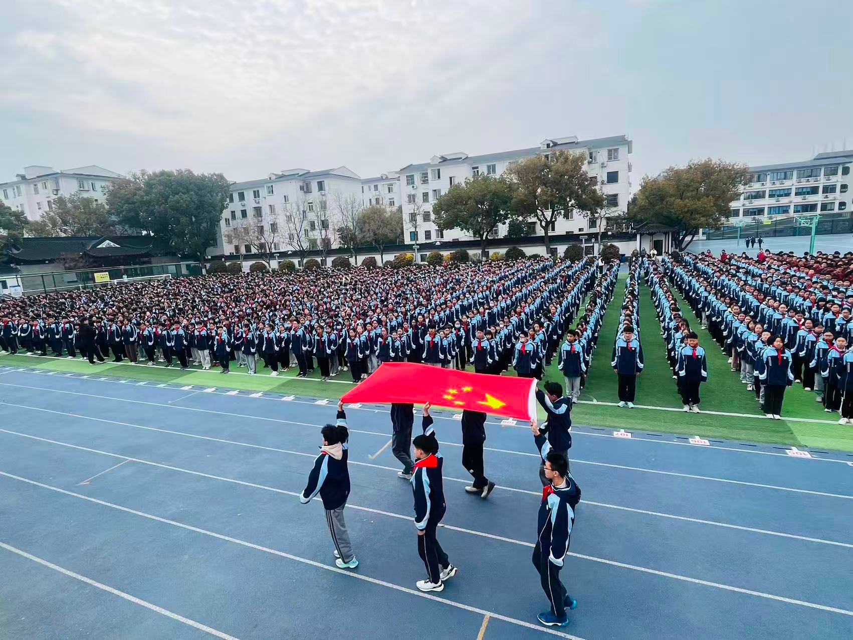 安全,是我们快乐学习、健康成长的根本保障,更是学校立德树人、培育仁勇少年的重要基石。2026年3月23日上午,苏州市振华中学校全体师生齐聚操场,举行“同在蓝天下 共筑安全梦”主题升旗仪式。升旗仪式由团少部巩帅帅老师主持,音乐组王臻老师指挥并领唱国歌。