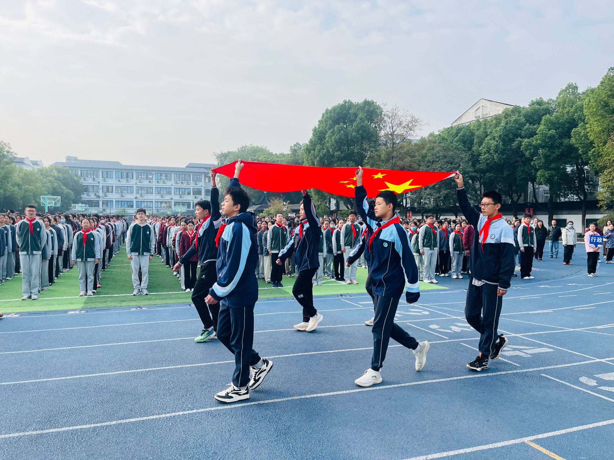 清晨的操场上,国旗班同学迈着铿锵有力的步伐护送国旗入场。伴随着庄严的国歌,五星红旗冉冉升起,全体师生肃立注目,少先队员行队礼,在领唱老师的带领下,全校师生齐声高唱国歌,场面肃穆而真挚。
