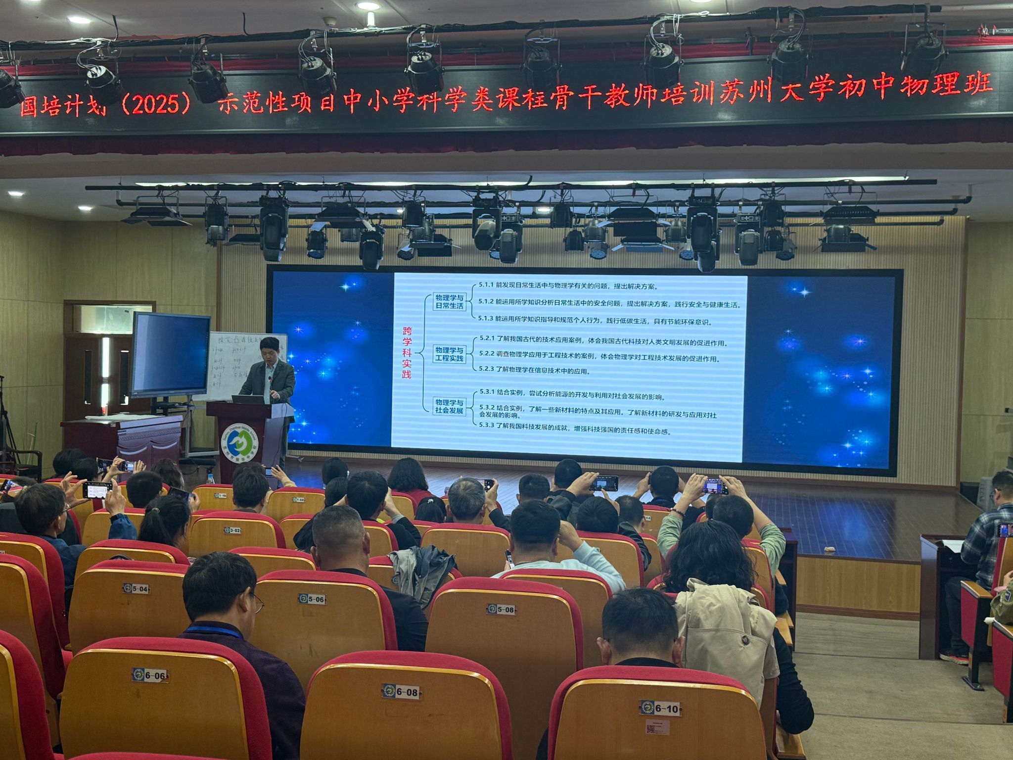 2025年10月22日,由苏州大学教育学院承办的“国培计划”示范性项目——中小学科学类课程骨干教师培训(初中物理组)在我校顺利举行。50位初中物理骨干教师齐聚一堂,围绕物理学科核心素养的提升与跨学科实践的探索,展开了一场深度与广度兼具的学习研修。