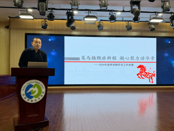 会上,王晓骅校长作了题为《策马扬鞭启新程 凝心聚力谱华章》的专题发言,带领大家学习领会《关于全面推进健康学校建设的指导意见》和《可能影响未成年人身心健康的网络信息分类办法》等文件精神,从德育、教学、教师发展、科技信息、体卫艺、后勤服务、校园安全、宣传与交流等方面,对2026年春季学期学校工作进行了全方位部署,明确目标任务,细化工作举措,强化统筹推进,奋力推动学校各项事业再上新台阶。
