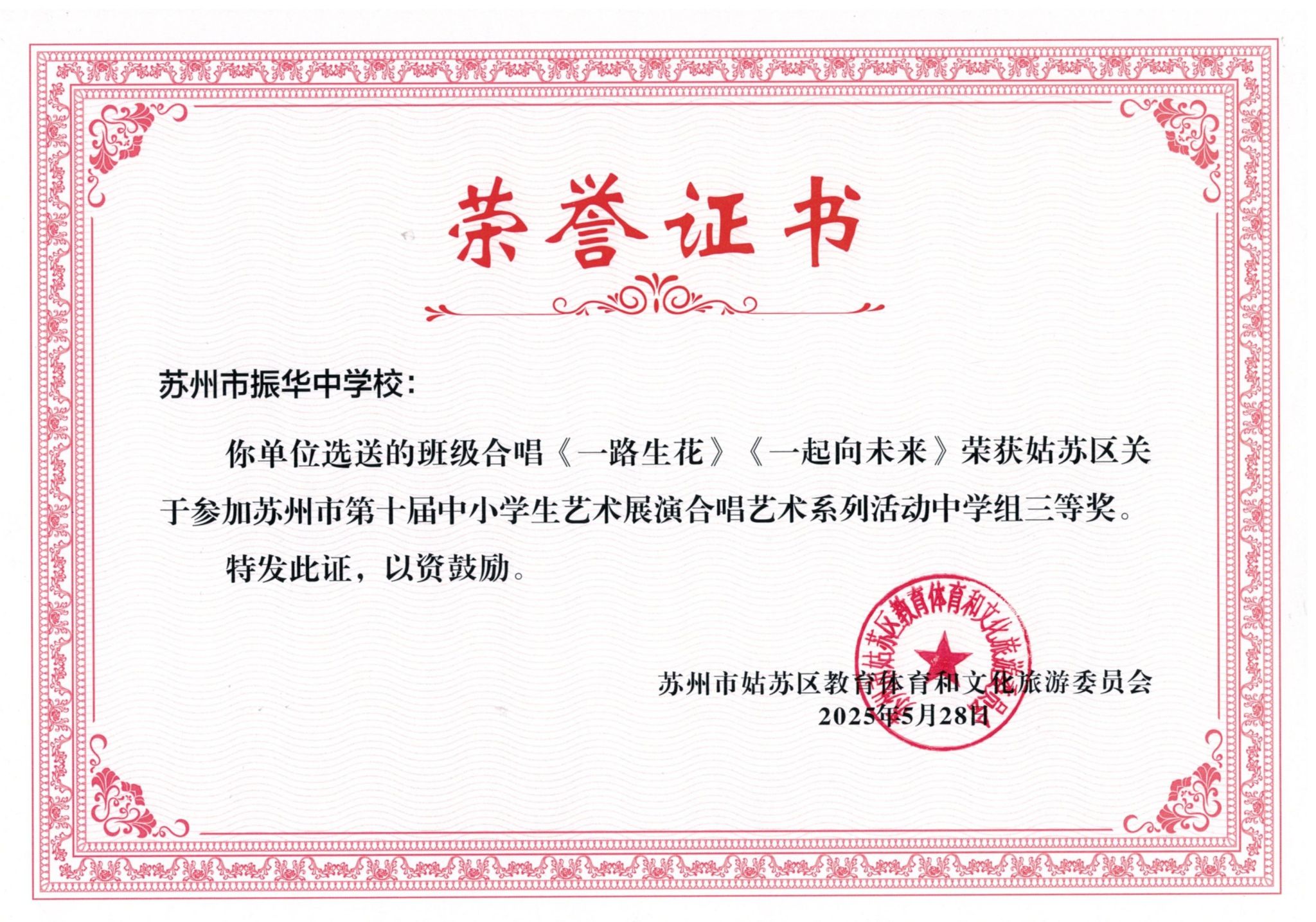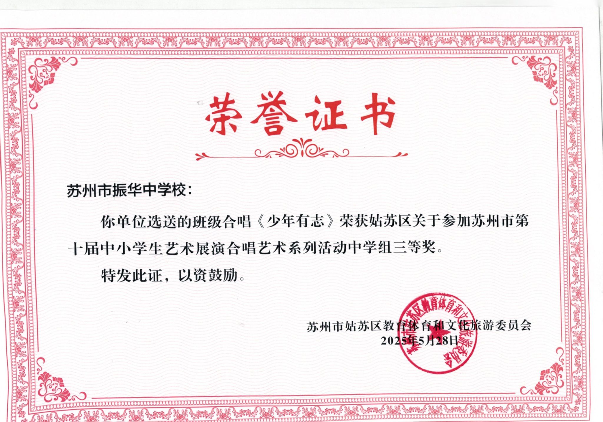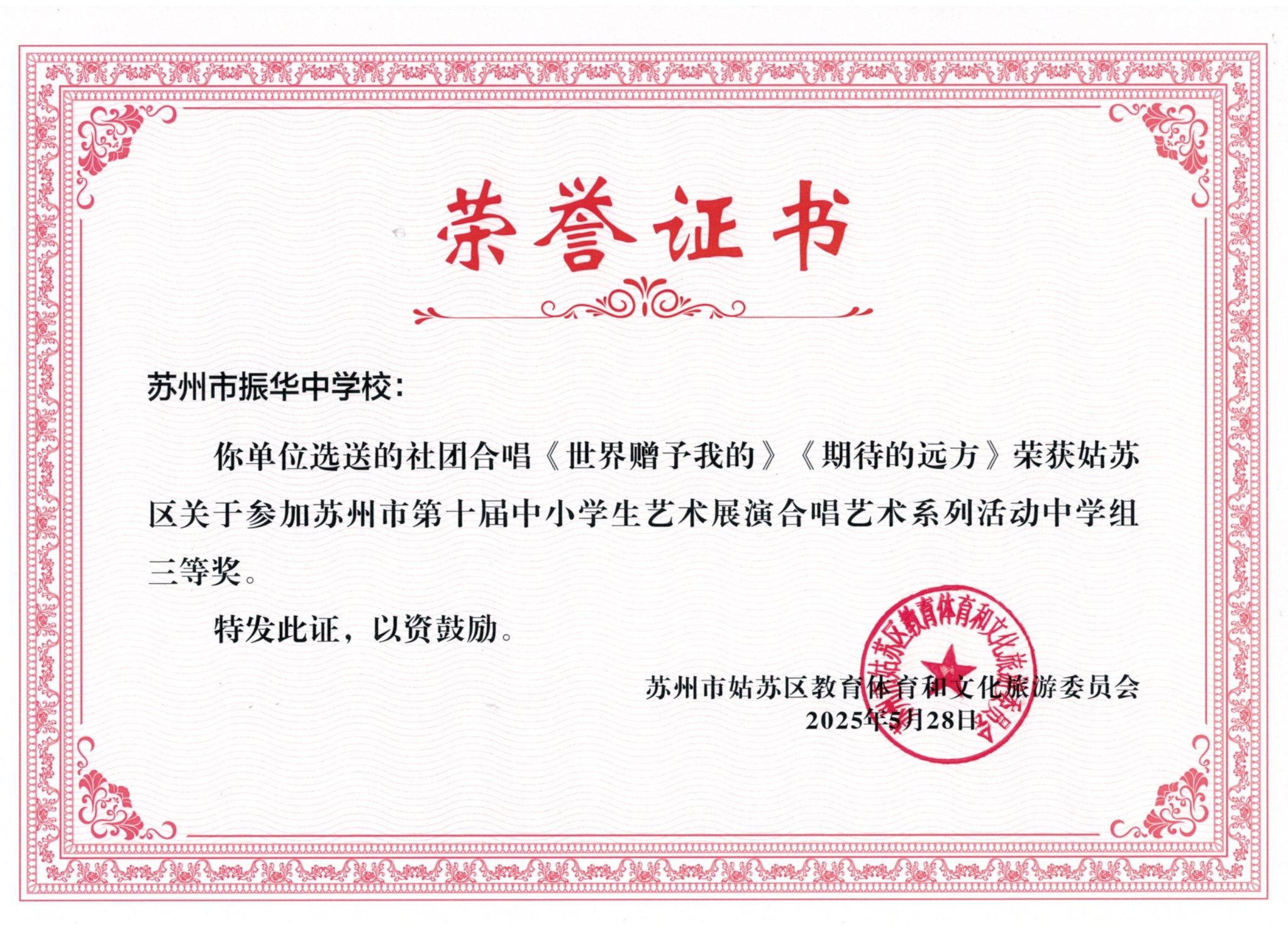 热烈祝贺我校社团合唱荣获姑苏区第十届中小学生艺术节展演合唱中学组三等奖