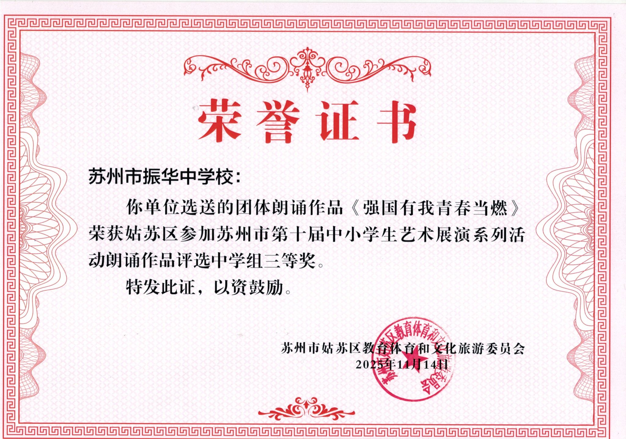 祝贺我校团体朗诵作品《强国有我青春当燃》荣获姑苏区苏州市第十届中小学生艺术展演系列活动朗诵作品评选中学组三等奖