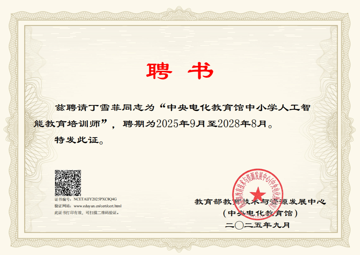 热烈祝贺我校丁雪菲老师获评“中央电化教育馆中小学人工智能教育培训师”