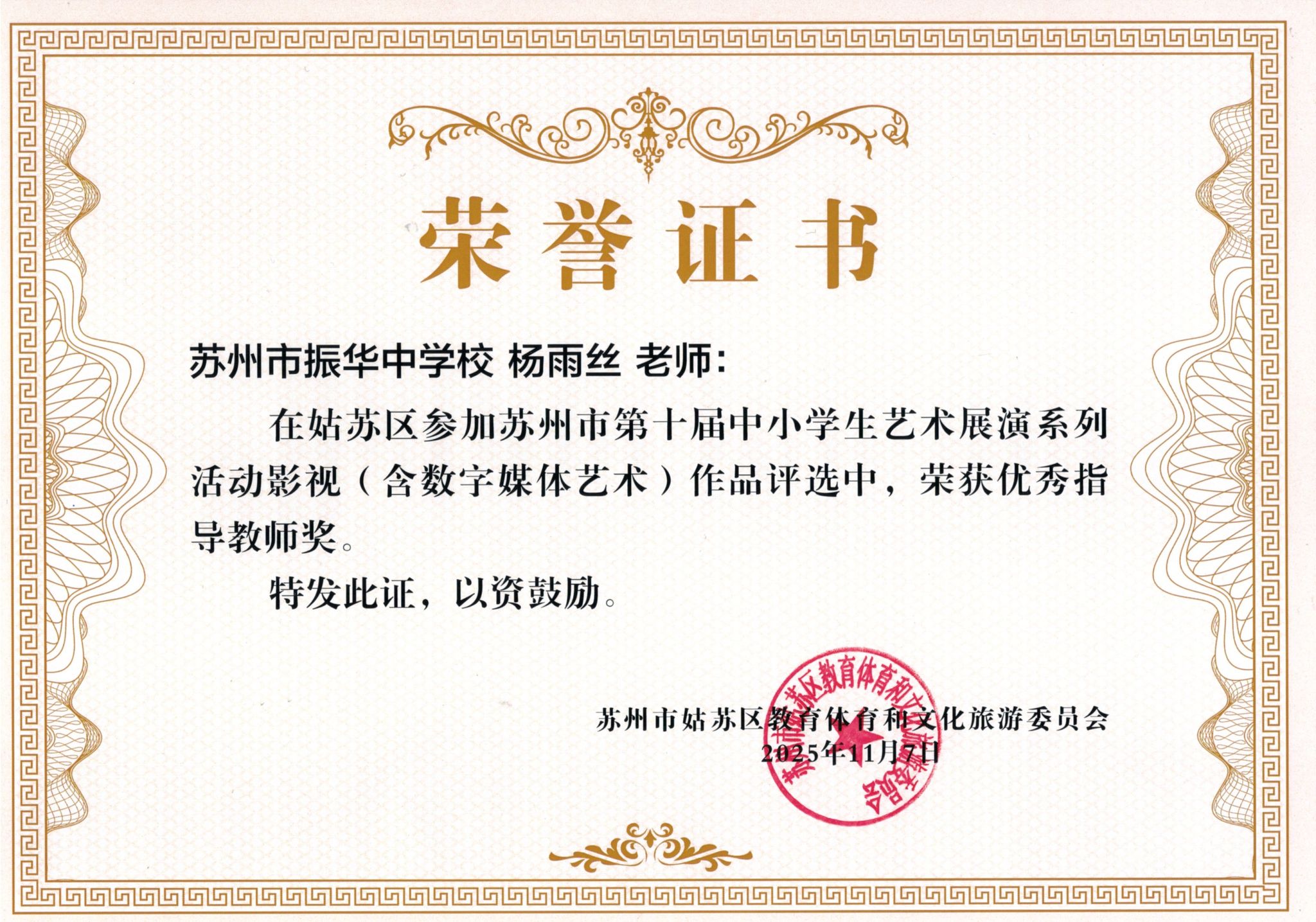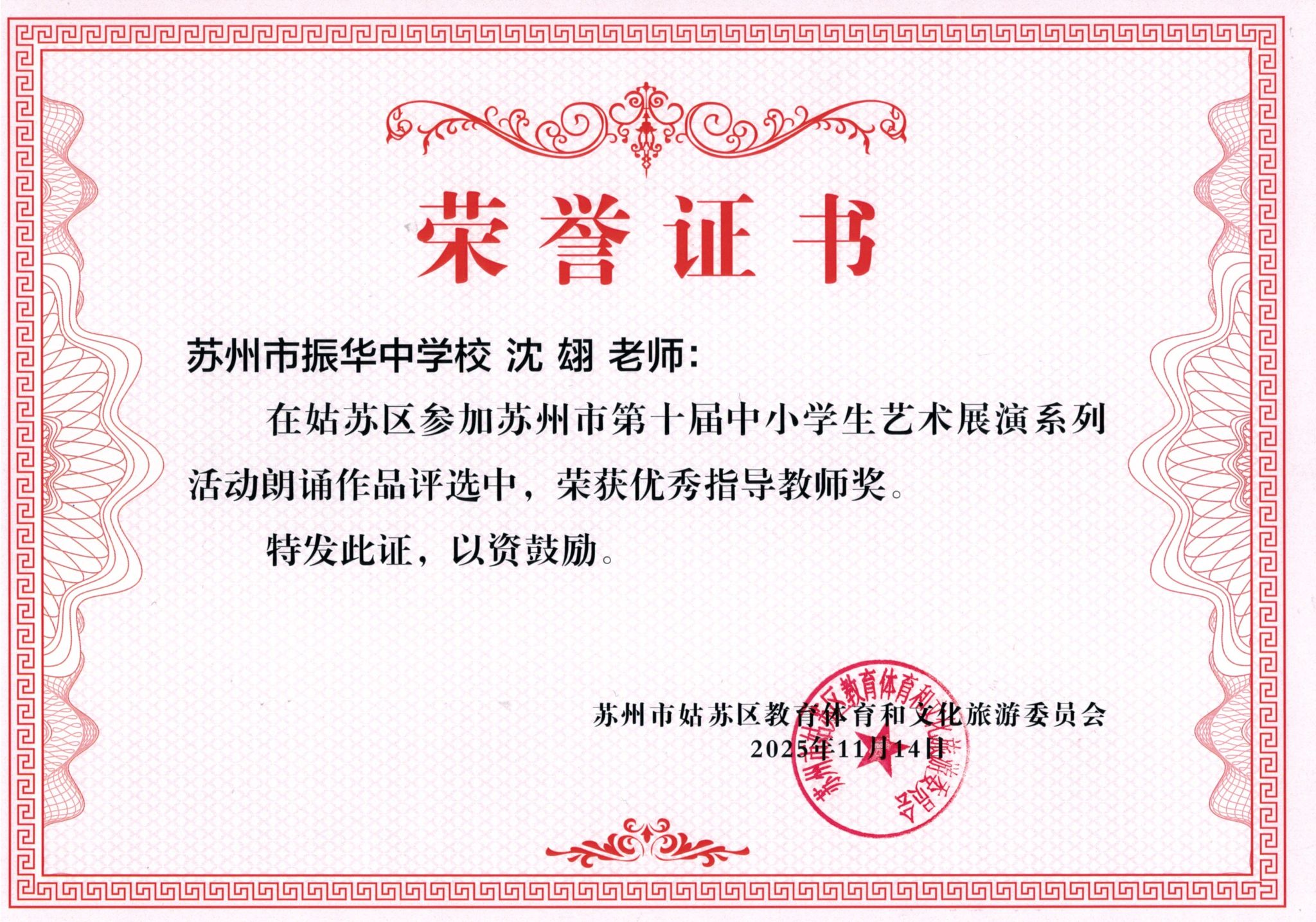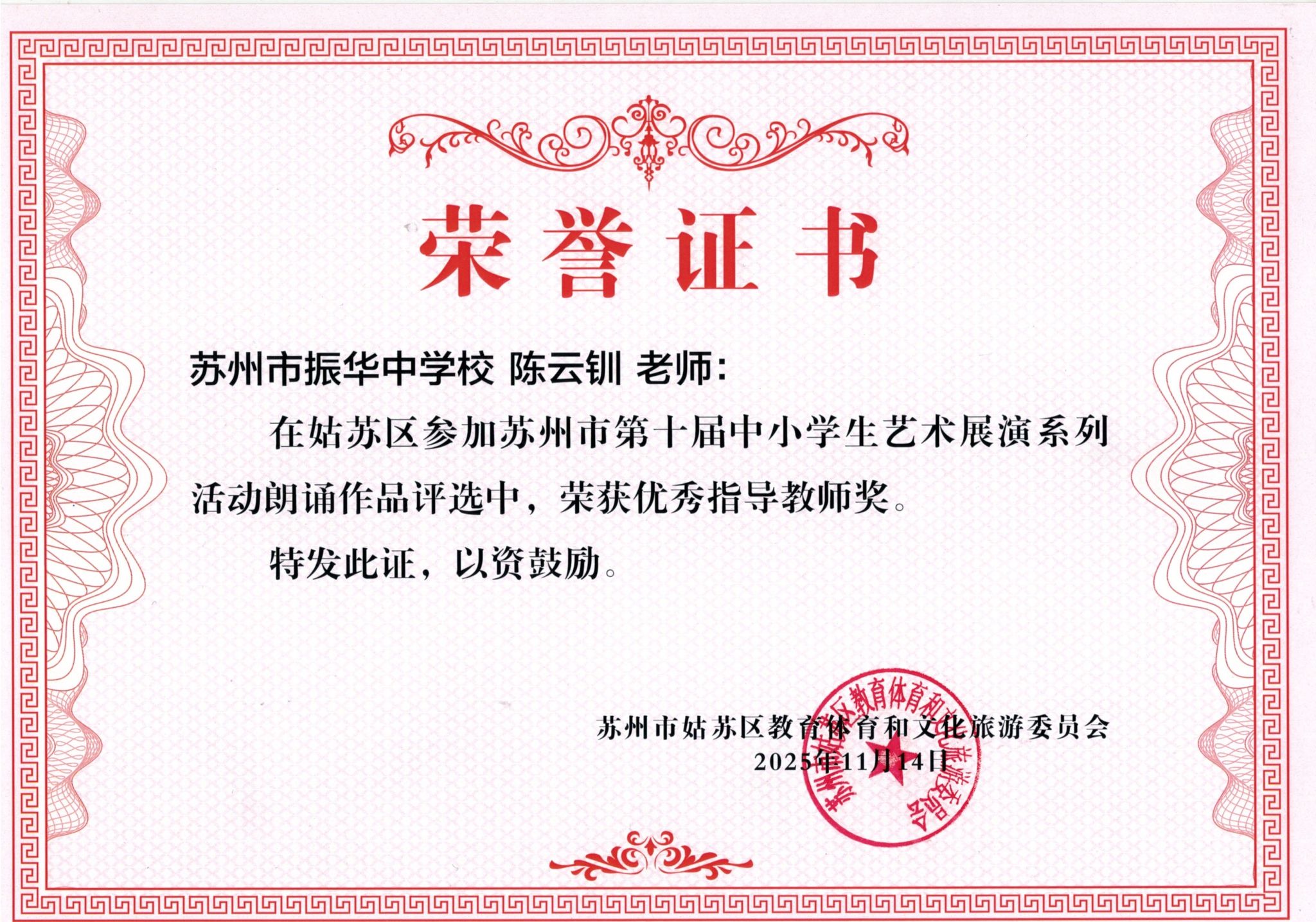 热烈祝贺我校陈云钏、沈翃、杨雨丝老师在姑苏区苏州市第十届中小学生艺术展演系列活动朗诵和影视作品评选中荣获优秀指导教师奖