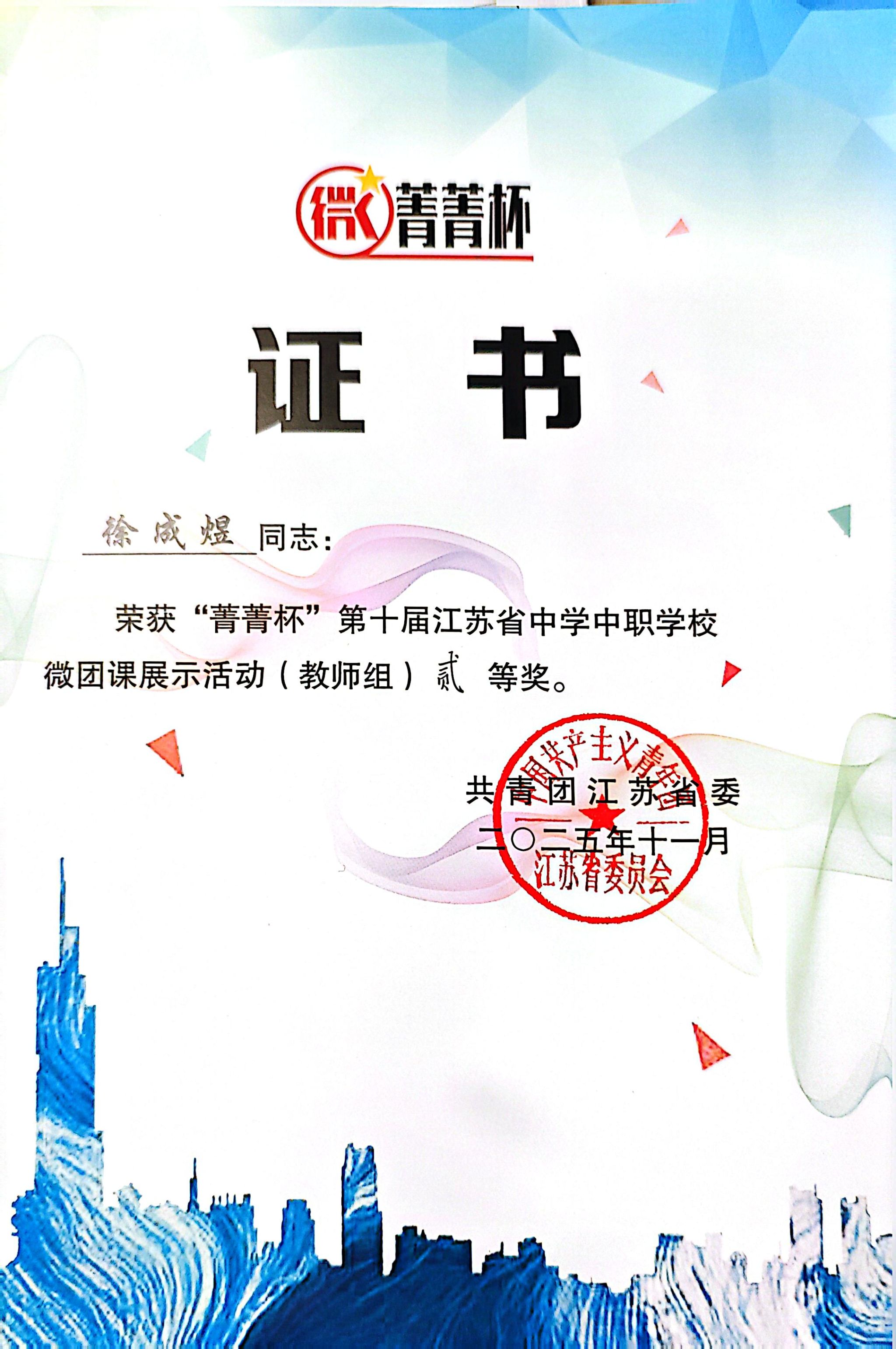 热烈祝贺我校徐成煜老师荣获“菁菁杯”第十届江苏省中学中职学校微团课展示活动(教师组)二等奖