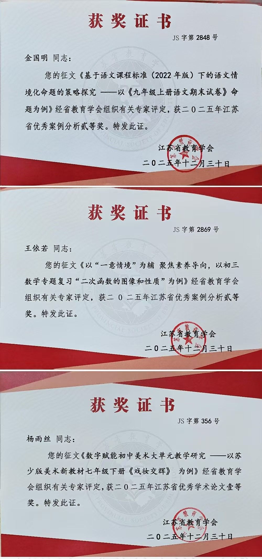 喜报:热烈祝贺我校金蓓蕾、李言、朱小燕老师在2025年姑苏区中小学校德育创新案例评选活动中荣获中学组二等奖!