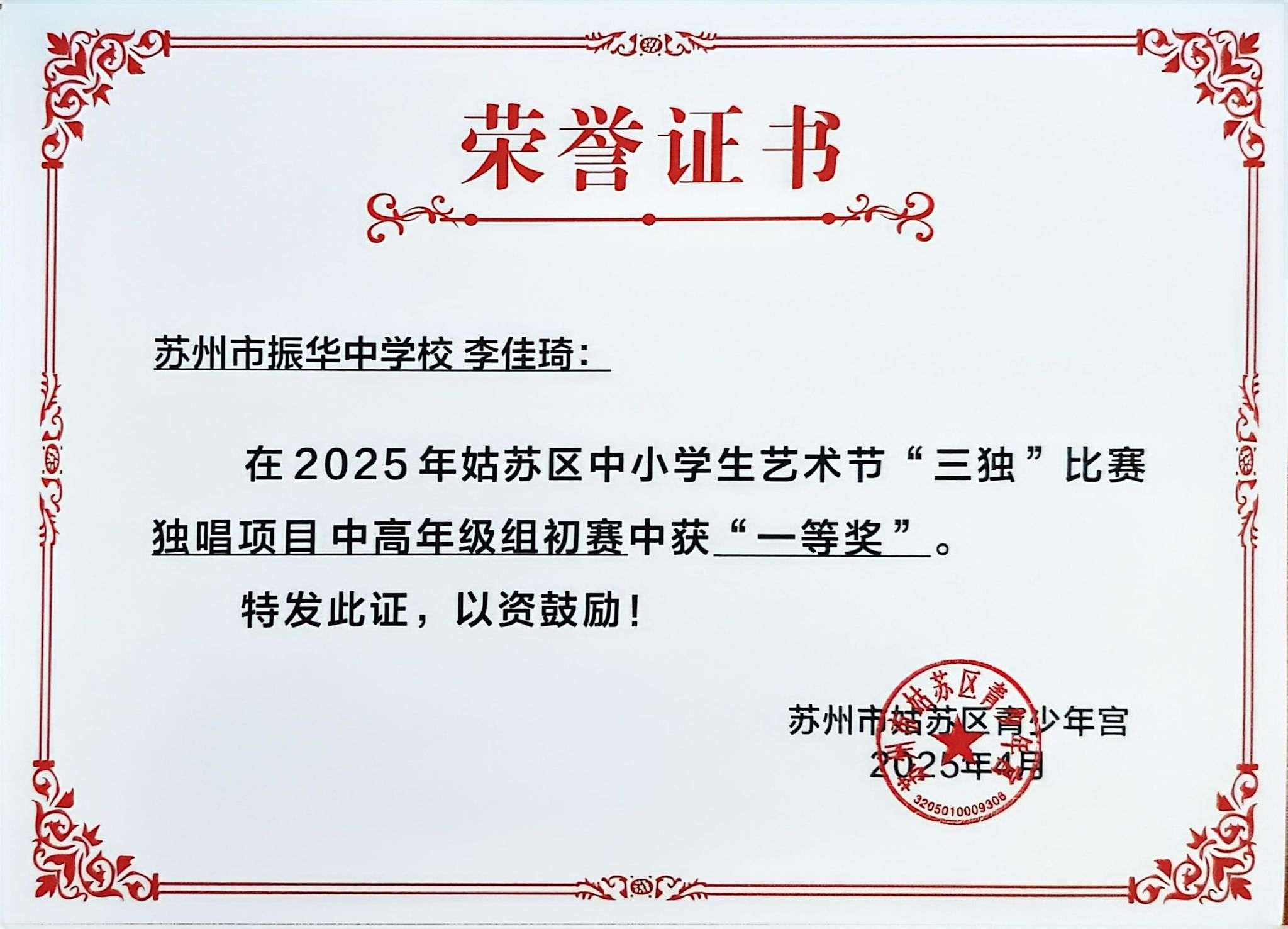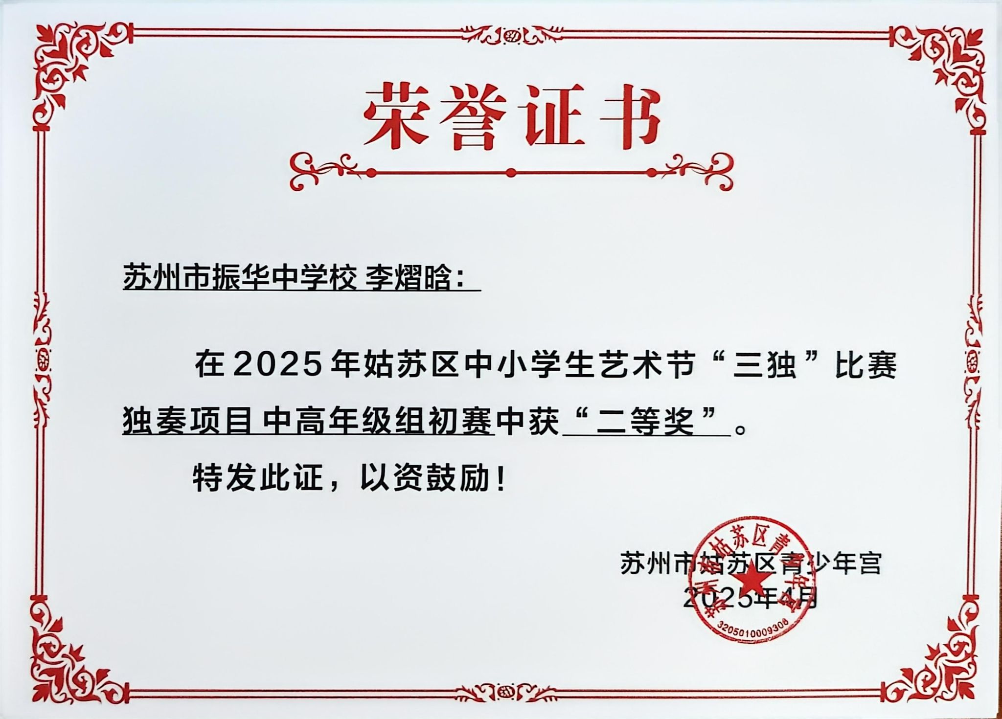 热烈祝贺我校十六位学生在2025年姑苏区中小学生艺术节“三独”比赛中获得优异成绩
