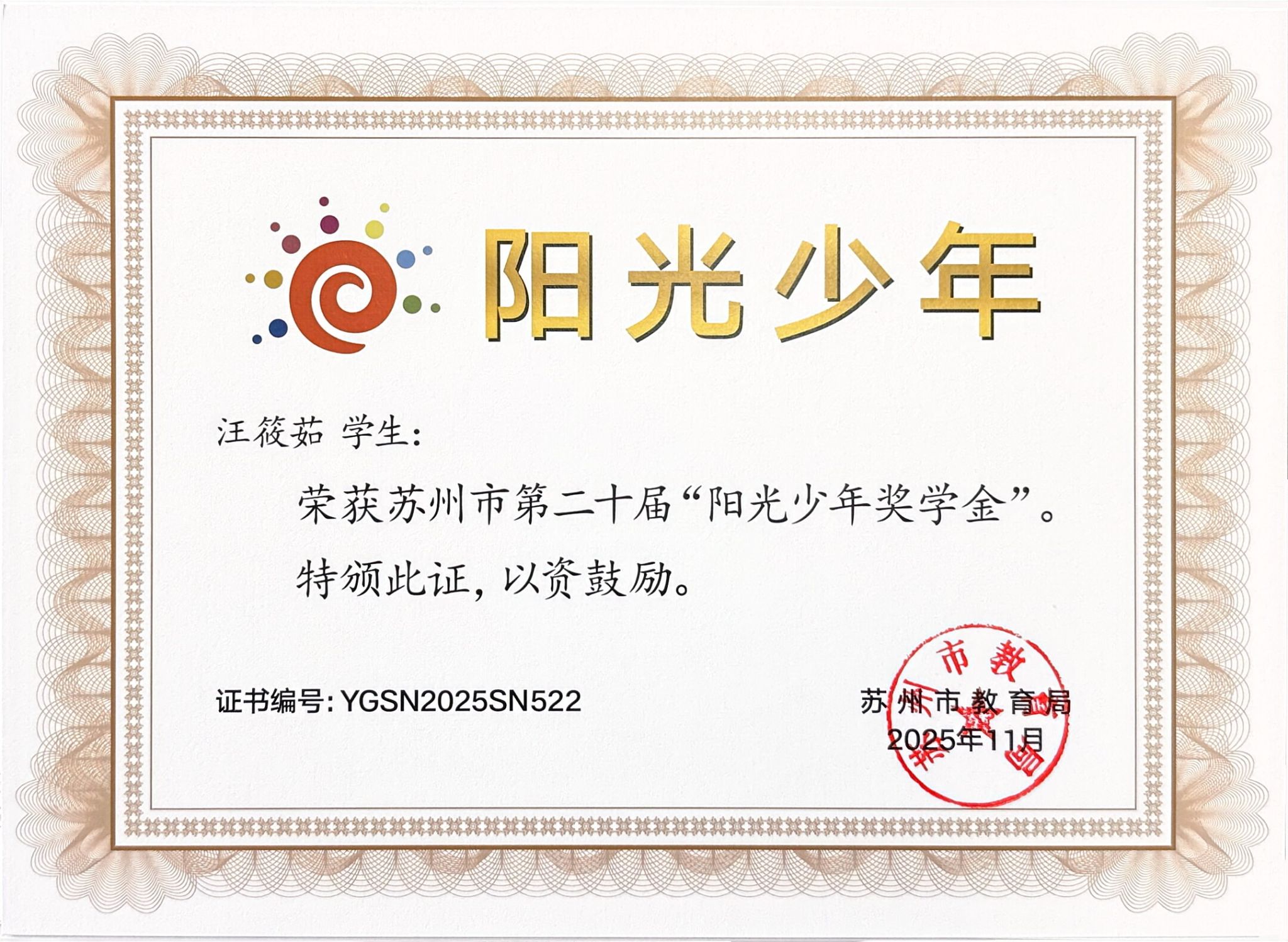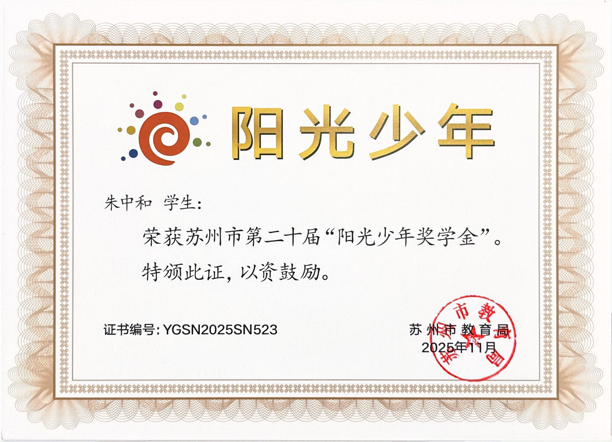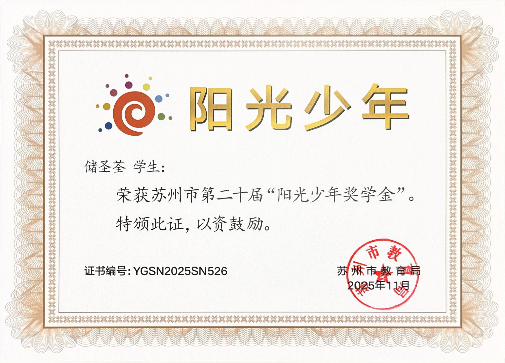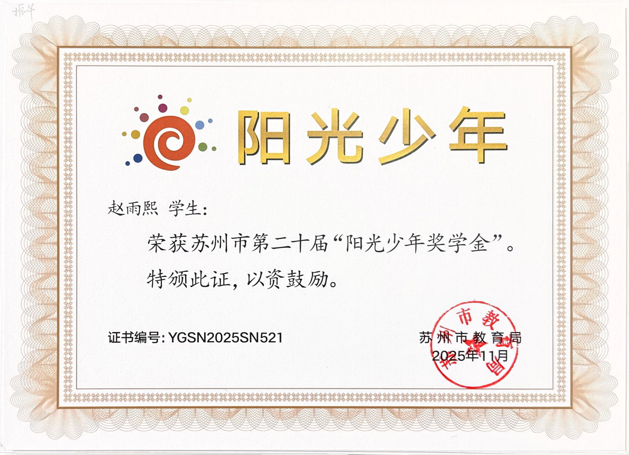 喜报:热烈祝贺我校赵雨熙、汪筱茹、朱中和、陶炫烨、张晨韵、储圣荃同学荣获苏州市第二十届“阳光少年奖学金”!