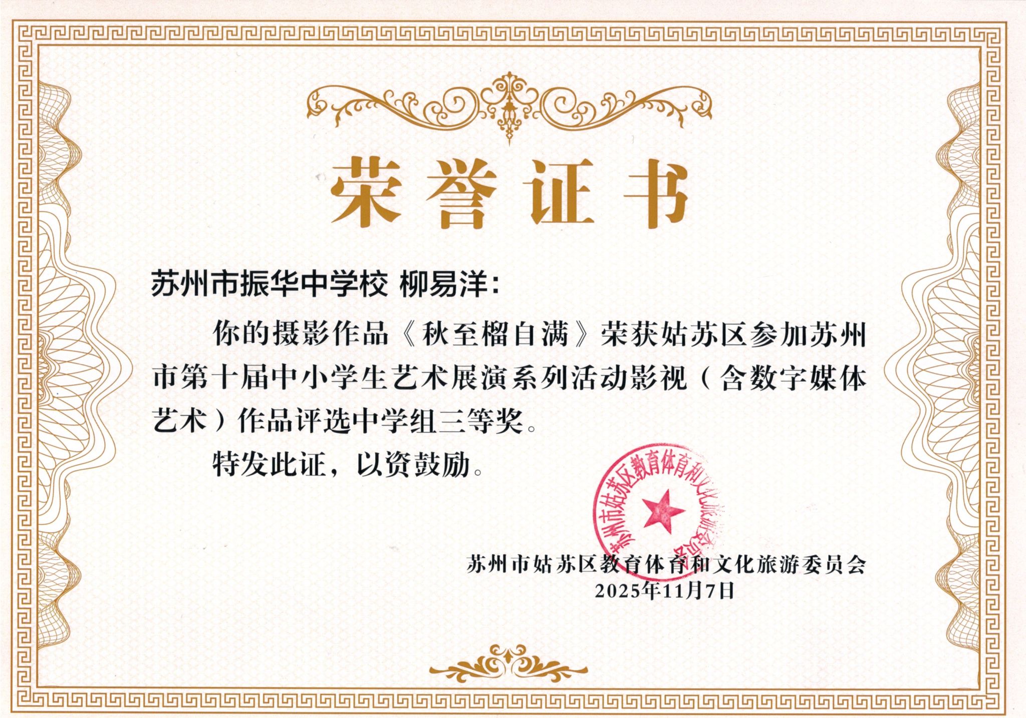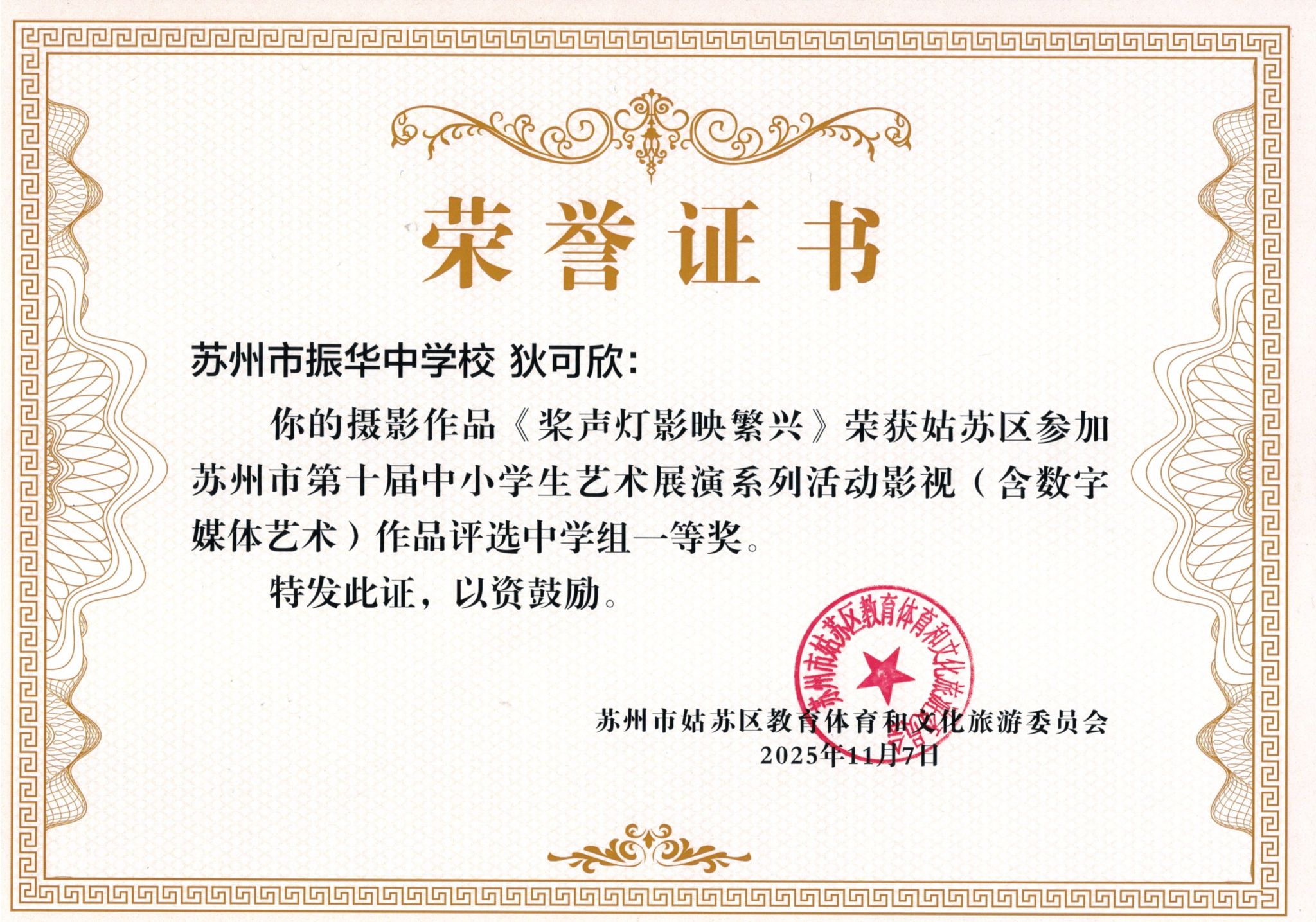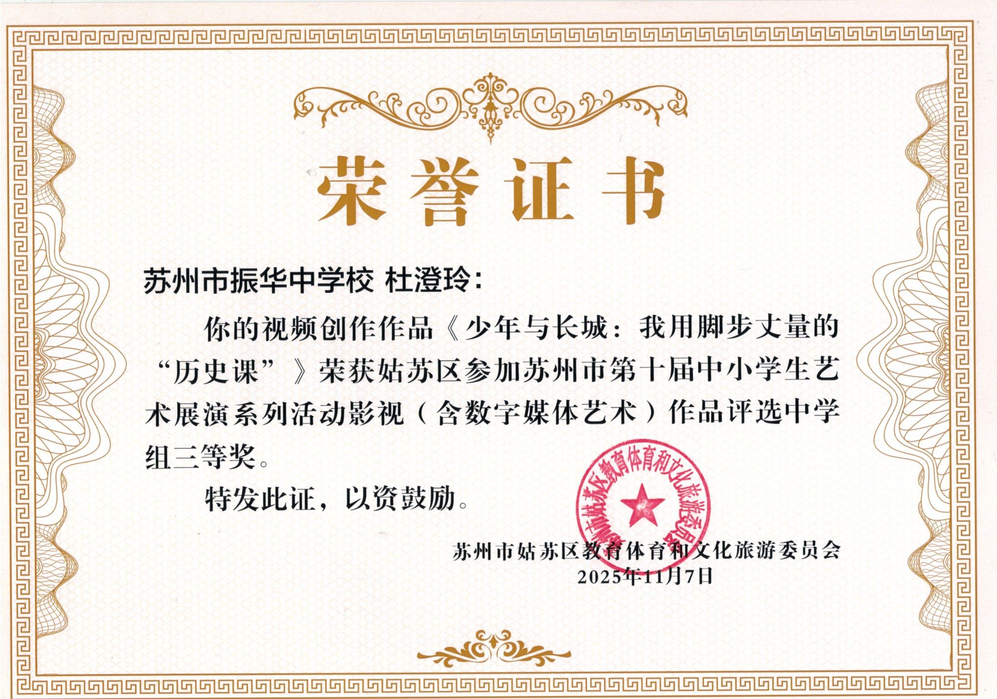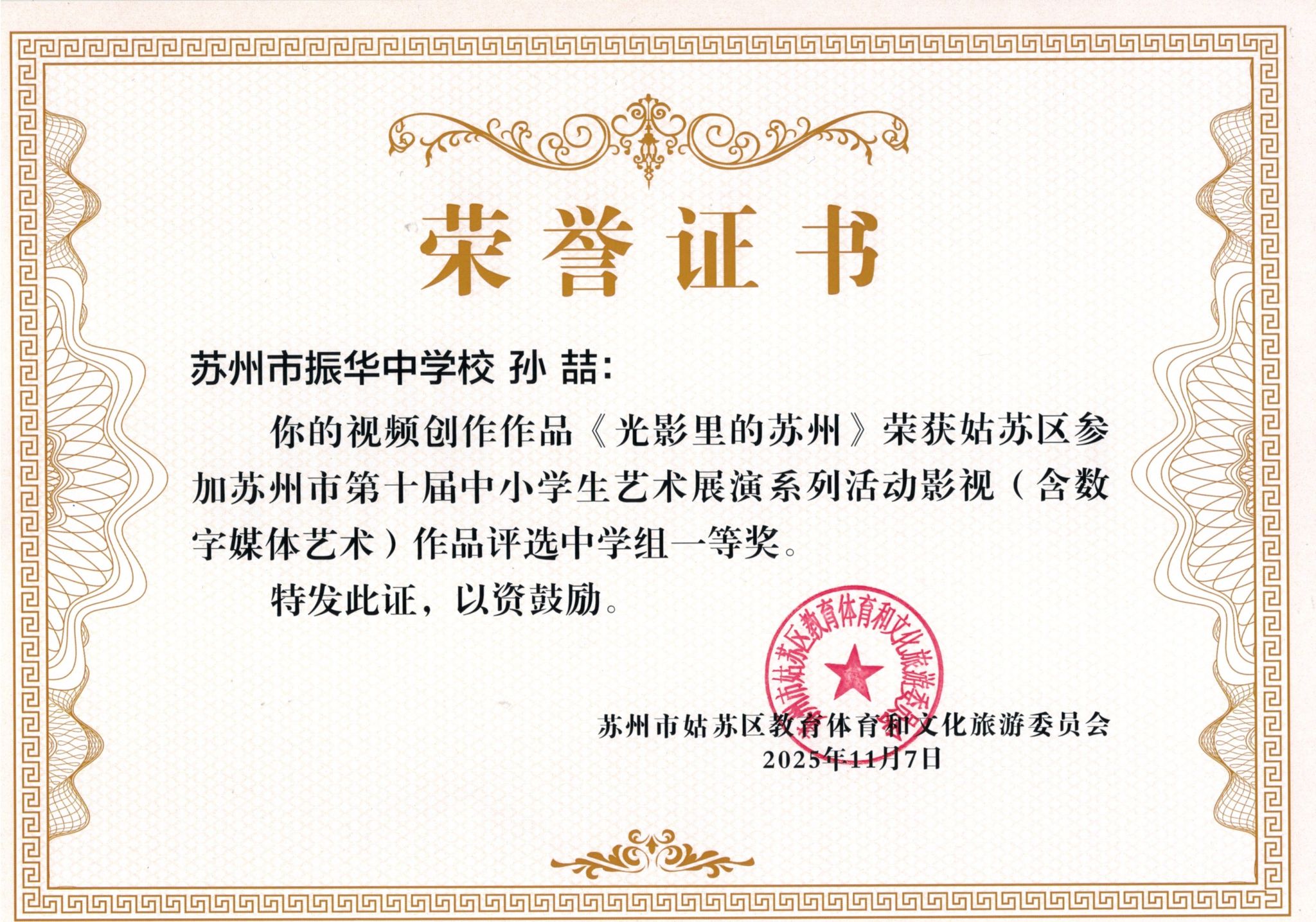 热烈祝贺我校孙喆、狄可欣、柳易洋、杜澄玲同学在姑苏区苏州市第十届中小学生艺术展演系列活动影视作品评选中获奖
