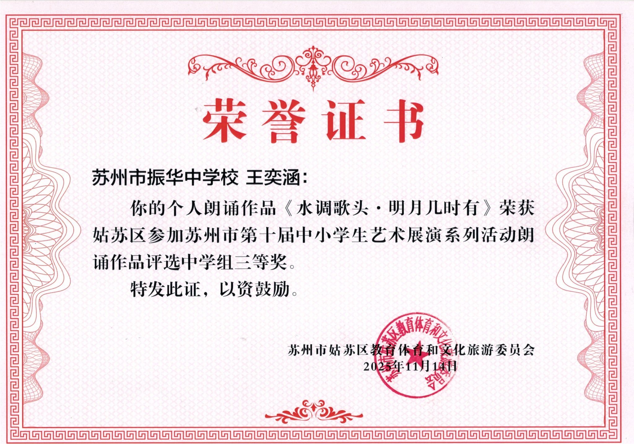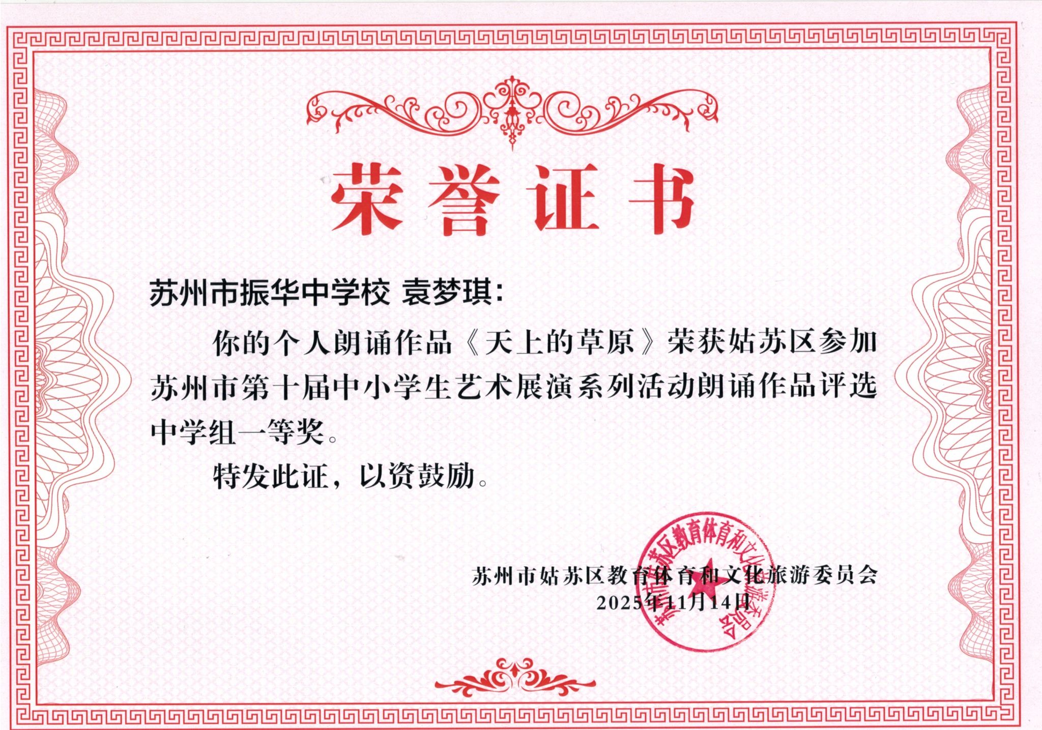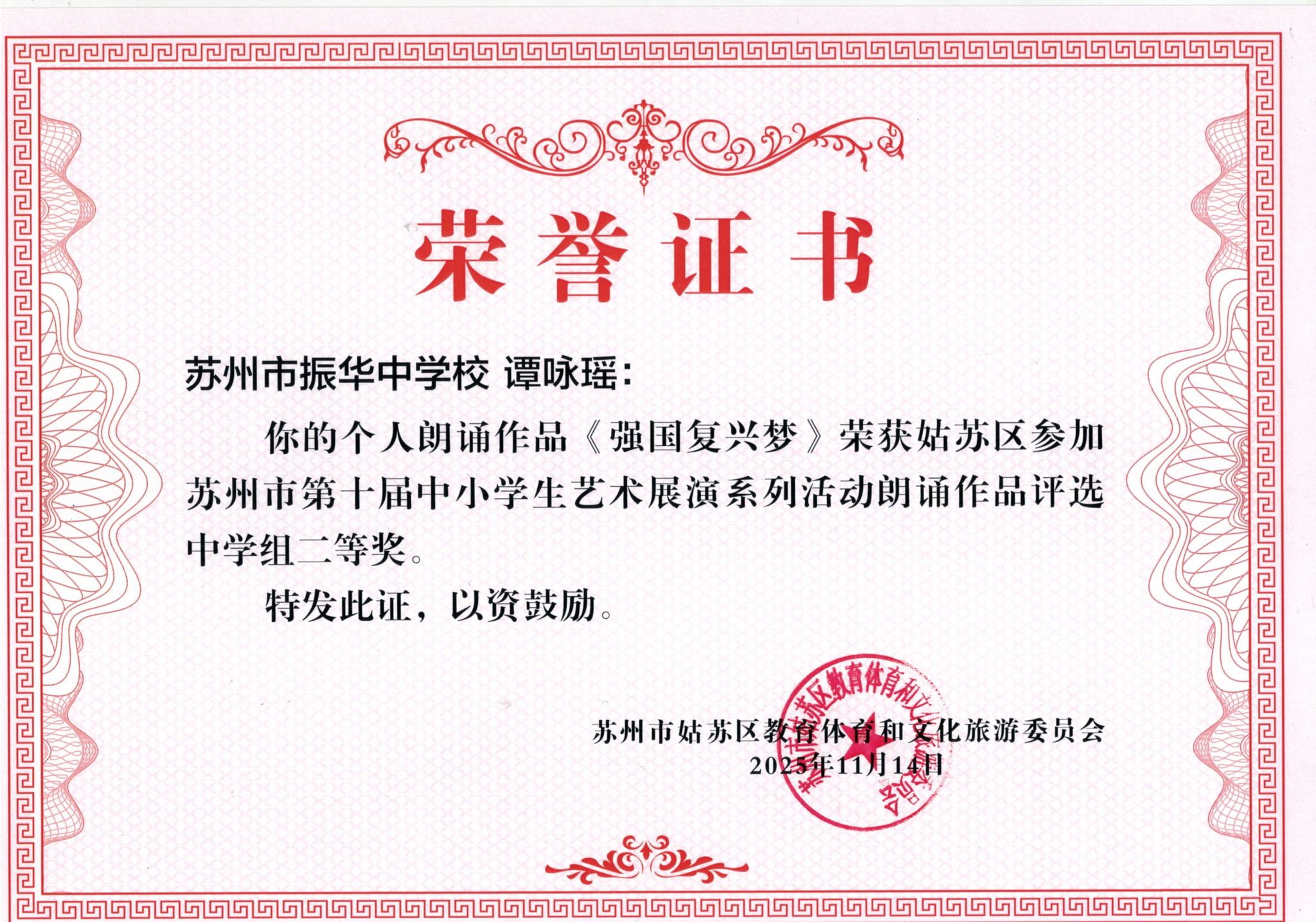 热烈祝贺我校袁梦琪、谭咏瑶、王奕涵、李品言、赵梓涵、毛曦彤、魏子淳同学在姑苏区苏州市第十届中小学生艺术展演系列活动朗诵作品评选中获奖