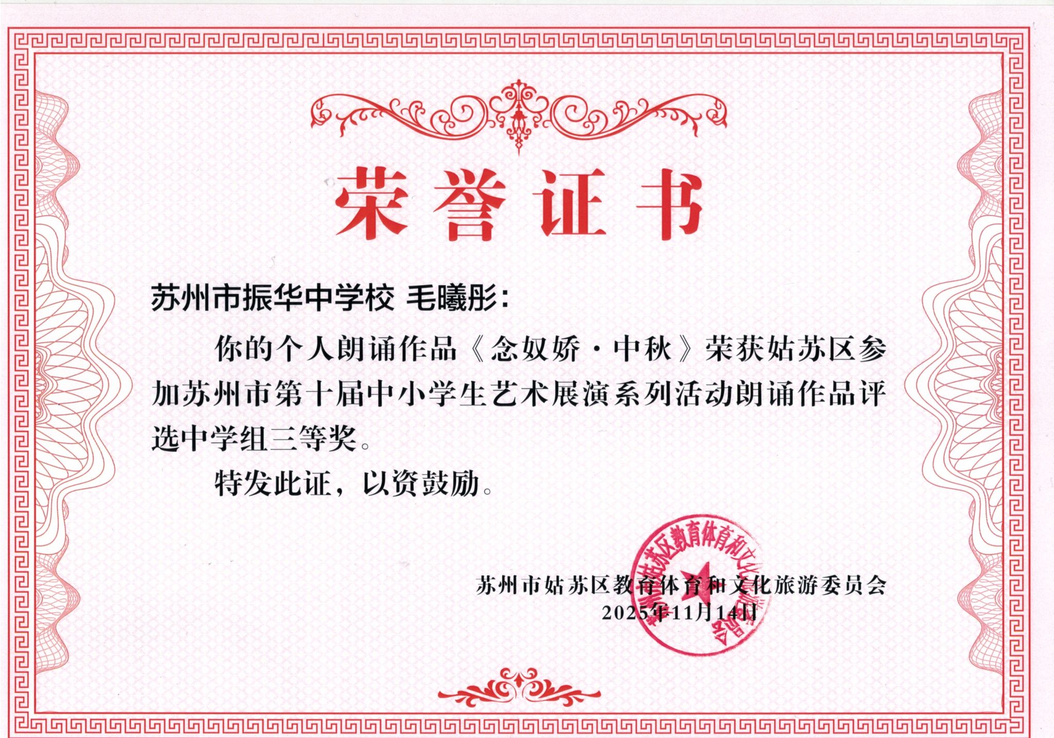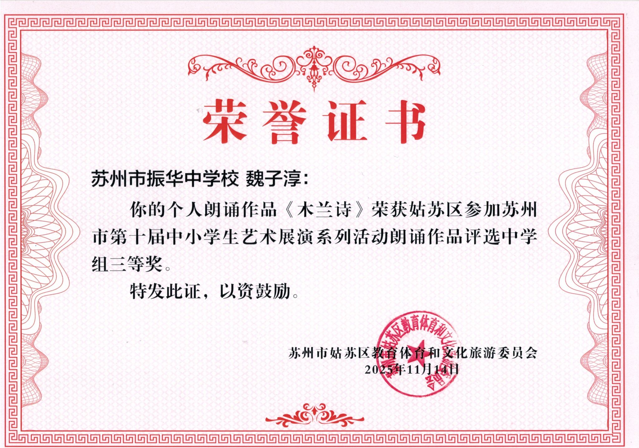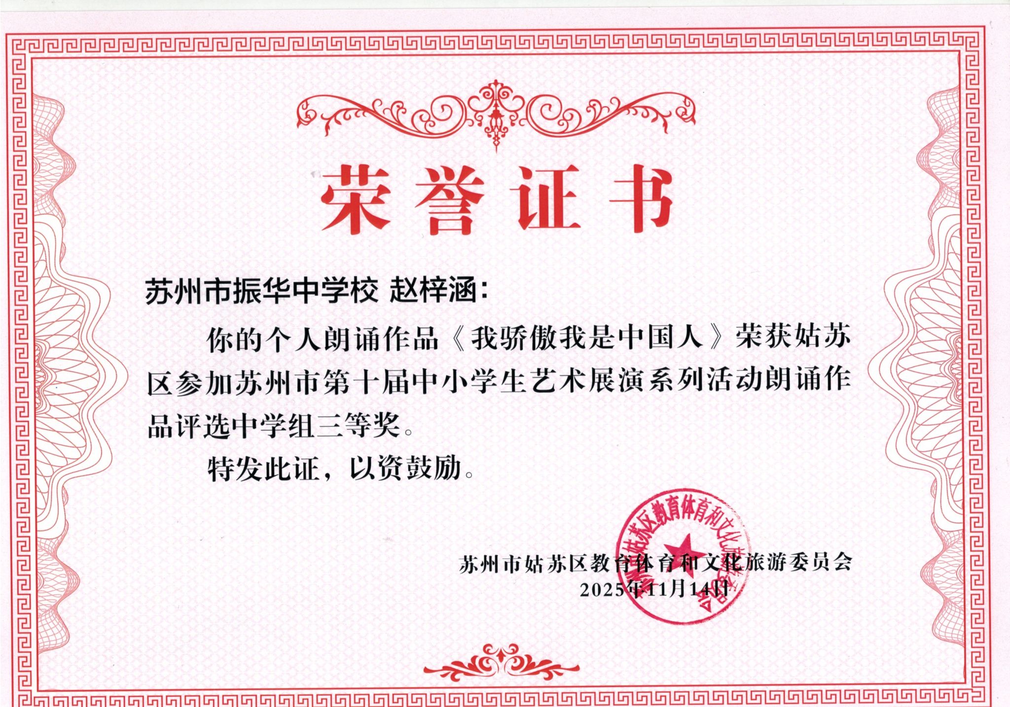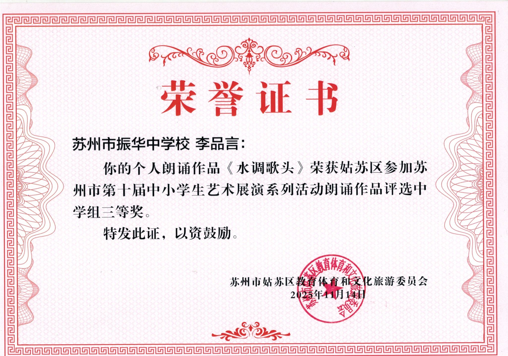 热烈祝贺我校袁梦琪、谭咏瑶、王奕涵、李品言、赵梓涵、毛曦彤、魏子淳同学在姑苏区苏州市第十届中小学生艺术展演系列活动朗诵作品评选中获奖
